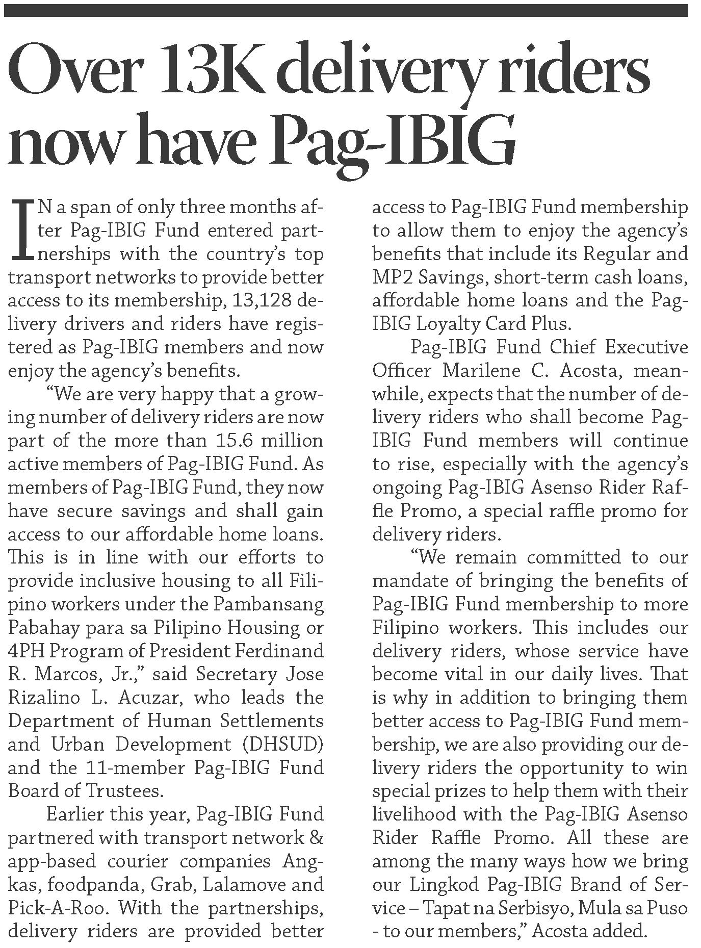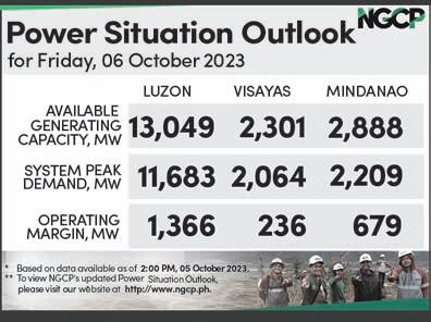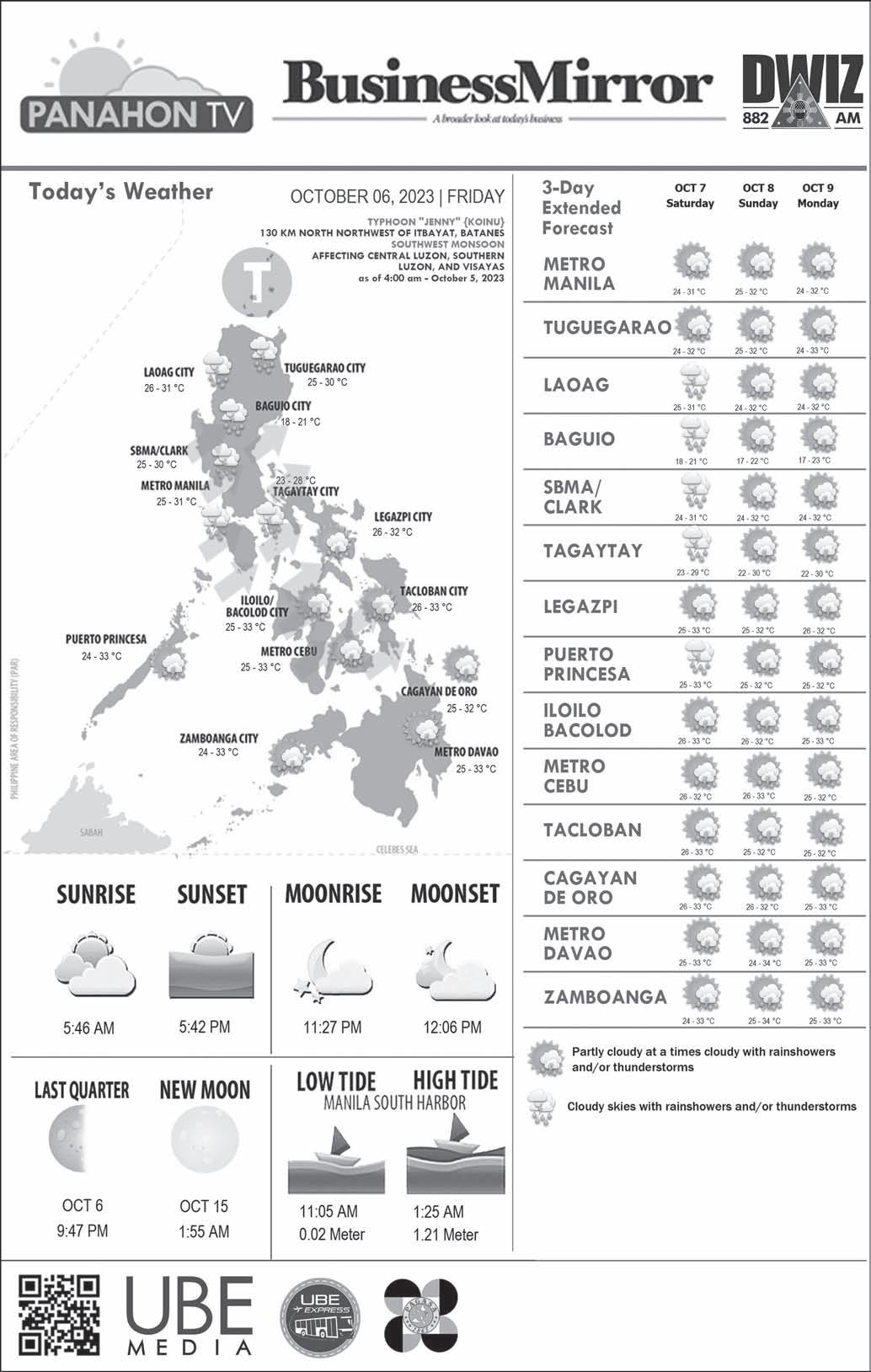 PESO E xchangE ratES n US 56.7490 n jaPan 0.3808 n UK 68.9046 n hK 7.2490 n chIna 7.7600 n SIngaP OrE 41.3834 n aUStralIa 35.8710 n EU 59.6375 n KOrE a 0.0420 n SaUDI arabIa 15.1310 Source: BSP (October 5, 2023) ‘RATE HIKE MORE LIKELY AFTER INFLATION SPIKE’ A broader look at today’s business www.businessmirror.com.ph n Friday, October 6, 2023 Vol. 18 No. 354 P25.00 nationwide | 2 sections 24 pages | 7 days a week BusinessMirror ROTARY CLUB OF MANILA JOURNALISM AWARDS 2006 National Newspaper of the Year 2011 National Newspaper of the Year 2013 Business Newspaper of the Year 2017 Business Newspaper of the Year 2019 Business Newspaper of the Year 2021 Pro Patria Award PHILIPPINE STATISTICS AUTHORITY 2018 Data Champion EJAP JOURNALISM AWARDS BUSINESS NEWS SOURCE OF THE YEAR (2017, 2018, 2019, 2020, 2021) DEPARTMENT OF SCIENCE AND TECHNOLOGY 2018 BANTOG MEDIA AWARDS Sept inflation rises to 6.1%, rice prices blamed WOrlDrEMIt: 1b PEOPlE DEPEnD On rEMIt tancES See “Rate,” A2 See “WorldRemit,” A2 See “Rice,” A2 Rice retail price could dip ₧3/kilo on ‘bumper’ By