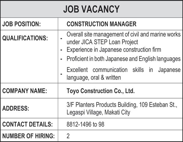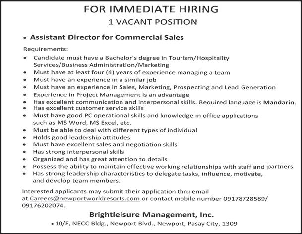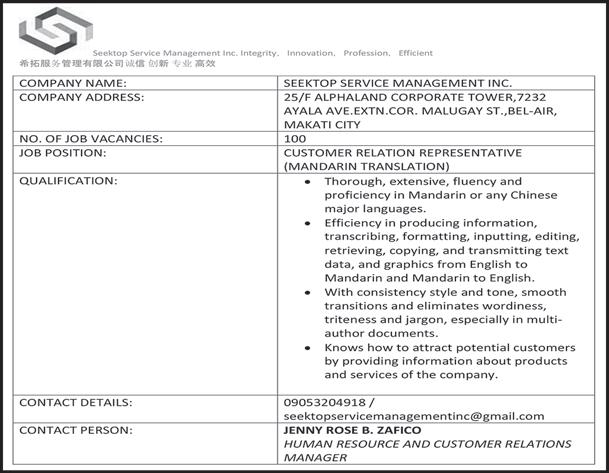 ESTABLISHMENT / ADDRESS No. NAME OF FOREIGN NATIONAL , POSITION AND BRIEF DESCRIPTION QUALIFICATION AND SALARY RANGE ESTABLISHMENT / ADDRESS No. NAME OF FOREIGN NATIONAL POSITION AND BRIEF DESCRIPTION QUALIFICATION AND SALARY RANGE ESTABLISHMENT / ADDRESS No. NAME OF FOREIGN NATIONAL , POSITION AND BRIEF DESCRIPTION QUALIFICATION AND SALARY RANGE 139. FIONA Chinese Speaking HR Associate Brief Job Description: Communicating with potential job candidates. Contacting candidate references and verifying education listings. Basic Qualification: Have excellent verbal and written communication skills and able to organize their work using tools. Salary Range: Php 30,000 - Php 59,999 140. DALE WONG TAI YOONG Chinese Speaking Program Designer Brief Job Description: Collaborate with other IT specialists, technicians to deliver software solutions. Basic Qualification: Have excellent verbal and written communication skills and able to organize their work using tools. Salary Range: Php 30,000 - Php 59,999 141. GAN, HANQIAN Chinese Speaking Program Designer Brief Job Description: Communicate overall design and approach to a team of programmers; and create flowcharts, diagrams and other models. Basic Qualification: Have excellent verbal and written communication skills and able to organize their work using tools. Salary Range: Php 30,000 - Php 59,999 142. SAM, VAN LONG Chinese Speaking Program Designer Brief Job Description: Communicate overall design and approach to a team of programmers; and create flowcharts, diagrams, other models, and programming instructions to guide programming team. Basic Qualification: With at least 6 months of experience, and good in verbal and written communication. Salary Range: Php 30,000 - Php 59,999 143. SHI, CAISHUANG Chinese Speaking Program Designer Brief Job Description: Contacting candidate references and verifying education listings. Basic Qualification: With at least 6 months of experience, and good in verbal and written communication. Salary Range: Php 30,000 - Php 59,999 144. WANG, RUIHONG Chinese Speaking Program Designer Brief Job Description: Collaborate with other IT specialists, technicians to deliver software solutions. Basic Qualification: With at least 6 months of experience, and good in verbal and written communication. Salary Range: Php 30,000 - Php 59,999 NEPC POWER CONSTRUCTION CORP. 15/f Cyber One Bldg., Eastwood Cyberpark City, Bagumbayan, Quezon City 145. ZHENG, CHENGZHI Mandarin Operations Supervisor Brief Job Description: Performs supervisory responsibilities for managing all aspects of the construction. Basic Qualification: Proven experience as Mandarin Operations Supervisor. Salary Range: Php 30,000 - Php 59,999 NEW ORIENTAL CLUB88 CORPORATION 1331 Pearl Plaza Bldg., 133 Quirino Ave., Tambo, City Of Parañaque Sky Garage Bldg., Aseana Avenue, Entertainment City, Tambo, City Of Parañaque 146. ZHAO, YINTUAN Chinese Customer Service Brief Job Description: Customer support and database services. Basic Qualification: Knowledgeable in computer application with good verbal and written communication skills. Salary Range: Php 30,000 - Php 59,999 147. NGUYEN THI LAM Vietnamese Customer Service Brief Job Description: Customer support and data base services. Basic Qualification: Knowledgeable in computer application with good verbal and written communication skills. Salary Range: Php 30,000 - Php 59,999 148. NGUYEN, THI QUYNH Vietnamese Customer Service Brief Job Description: Customer support and data base services. Basic Qualification: Knowledgeable in computer application with good verbal and written communication skills. Salary Range: Php 30,000 - Php 59,999 149. NGUYEN, VAN TUAN Vietnamese Customer Service Brief Job Description: Customer support and database services. Basic Qualification: Knowledgeable in computer application with good verbal and written communication skills. Salary Range: Php 30,000 - Php 59,999 OCEAN MIGHT SUPPORT MANAGEMENT INC. 33/f Tower 6789, Ayala Ave., Bel-air, City Of Makati 150. LUU THI YEN Customer Service Representative Brief Job Description: Responsible for handling questions, comments and complaints regarding a particular business. Their ultimate goal is to provide positive customer experiences by enhancing relationships between them. Basic Qualification: 18-55 y/o, with at least 6 months of experience, and with good verbal and written skills. Salary Range: Php 30,000 - Php 59,999 POWERCHINA B7 PHILIPPINES CORP. Unit 2101 21/f Bdo Equitable Bank Tower, 8751 Paseo De Roxas, Bel-air, City Of Makati 151. LIU, QIHUA Construction Technician Brief Job Description: Supervise the equipment and check the operators. Basic Qualification: Must know how to speak Mandarin. Salary Range: Php 30,000 - Php 59,999 152. DAI, JUNJIE Logistic Supervisor Brief Job Description: Shipment supervision and monitoring. Basic Qualification: Must know how to speak Mandarin. Salary Range: Php 30,000 - Php 59,999 POWERCHINA PHILIPPINES CORPORATION Unit 2101 21/f Bdo Equitable Tower, 8751 Paseo De Roxas, Bel-air, City Of Makati 153. DU, WEIHONG Chinese Hydroelectric Plant Technician Brief Job Description: Operating and maintaining various components of the power plant and monitor the operations of these systems. Basic Qualification: Fluent in Mandarin and English. With working knowledge in the field of construction. Salary Range: Php 30,000 - Php 59,999 154. GUO, PEIXIN Chinese Hydroelectric Plant Technician Brief Job Description: Operating and maintaining various components of the power plant and monitor the operations of these systems. Basic Qualification: Fluent in Mandarin and English. With working knowledge in the field of construction. Salary Range: Php 30,000 - Php 59,999 155. MA, LULU Chinese Hydroelectric Plant Technician Brief Job Description: Operating and maintaining various components of the power plant and monitor the operations of these systems. Basic Qualification: Fluent in Mandarin and English. With working knowledge in the field of con