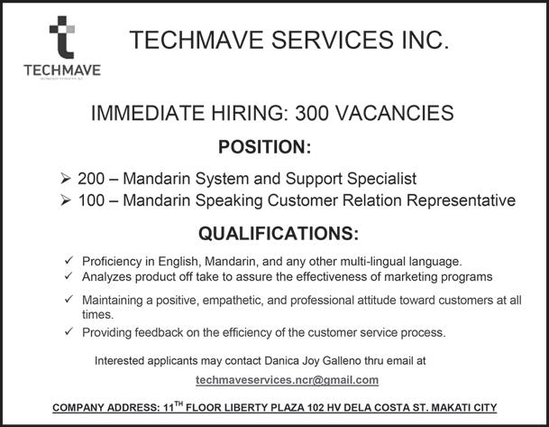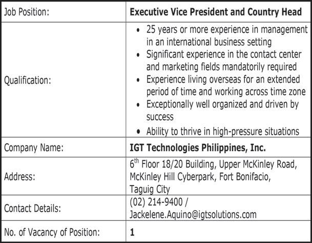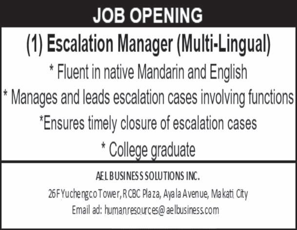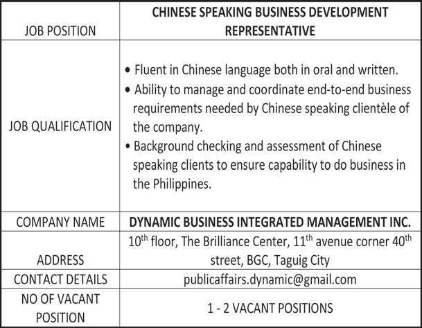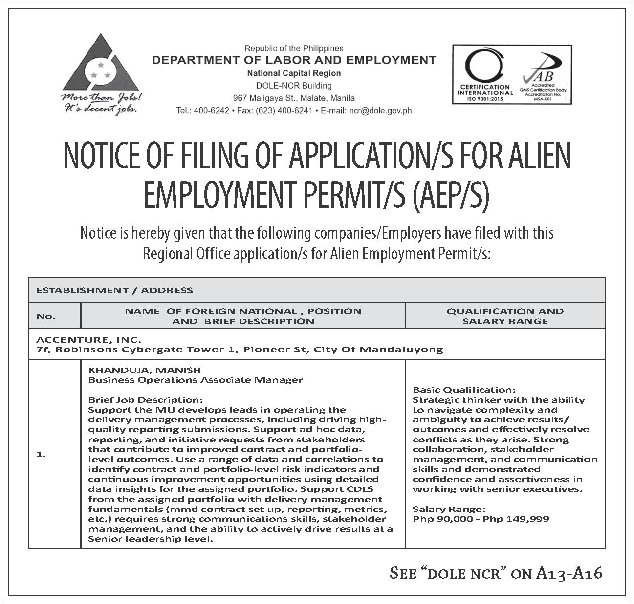 ESTABLISHMENT / ADDRESS No. NAME OF FOREIGN NATIONAL , POSITION AND BRIEF DESCRIPTION QUALIFICATION AND SALARY RANGE ESTABLISHMENT / ADDRESS No. NAME OF FOREIGN NATIONAL POSITION AND BRIEF DESCRIPTION QUALIFICATION AND SALARY RANGE ESTABLISHMENT / ADDRESS No. NAME OF FOREIGN NATIONAL , POSITION AND BRIEF DESCRIPTION QUALIFICATION AND SALARY RANGE 41. YANG, YANG Chinese Speaking HR Associate Brief Job Description: Managing HR records including, resumes, applicant logs, and employee forms. Basic Qualification: Excellent communication and interpersonal skills. Previous experience working in human resources. Salary Range: Php 30,000 - Php 59,999 42. CHENH KIM PHUONG Chinese Speaking Program Designer Brief Job Description: Testing and deploying programs, and systems, verifying, and deploying programs, and systems. Basic Qualification: With experience in computer-aided design. Good in verbal and written. Salary Range: Php 30,000 - Php 59,999 43. HOANG THI HIEN Chinese Speaking Program Designer Brief Job Description: Testing and deploying programs, and systems, verifying, and deploying programs, and systems. Basic Qualification: With experience in computer-aided design. Good in verbal and written. Salary Range: Php 30,000 - Php 59,999 DIGICHROM INC. Unit 2001-a, 2602 & 2603 20/f & 26/f Pbcom Tower, 6795 Ayala Ave. Cor. V.a. Rufino St., Bel-air, City Of Makati 44. TRINH KIET Vietnamese Speaking Customer Service Representative Brief Job Description: Manage incoming and outgoing calls, chats and emails. Basic Qualification: Proficient in speaking reading and writing in Vietnamese. Salary Range: Php 30,000 - Php 59,999 DSV AIR & SEA, INC. 6/f 8912, Aseana Ave. Bldg. Cor. N. Abueva Street, Tambo, City Of Parañaque 45. GONISHI, RYO Business Development Manager, Strategic Accounts - Japanese Brief Job Description: Secure, develop and maintain accounts with Japanese companies. Establish and grow long-term business relationships with Japanese companies’ stakeholders. Basic Qualification: College graduate. Fluent in Japanese language. Highly skilled in dealing with C-suite executives of Japanese companies. Salary Range: Php 90,000 - Php 149,999 EASTERN GOLD CORPORATION 503, Nueva St., Barangay 289, Binondo, City Of Manila 46. ZHANG, JIE Marketing And Sales Agent Brief Job Description: Researches and develops various marketing strategies for products and services and implements marketing plans and works to meet sales quotas. Basic Qualification: Can contributes information, ideas, and research to help develop marketing strategies; and can help to detail, design, and implement marketing plans for each product or service being offered. Salary Range: Php 30,000 - Php 59,999 EASYTECH SUPPORT INC. 9-11/f, 14/f Capella Bldg., Asean Drive Filinvest, Alabang, City Of Muntinlupa 47. LI, DONGLIAN Mandarin Speaking Customer Service Representative Brief Job Description: Recommends potential products or services to management by collecting information and analyzing customer needs. Basic Qualification: Proficient in speaking, reading and writing in Mandarin. Salary Range: Php 30,000 - Php 59,999 48. NGUYEN THI NGA Vietnamese Speaking Customer Service Representative Brief Job Description: Responding to Vietnamese customer queries via email, live chat, video, phone, and social media channels. Basic Qualification: Proficient in Vietnamese speaking. Salary Range: Php 30,000 - Php 59,999 ENCORA MANAGEMENT SERVICES PHILIPPINES INC. U-801/802 8/f Bdo Plaza, 8737 Paseo De Roxas, Bel-air, City Of Makati 49. DAS, NILIM BINOY Engagement Manager Brief Job Description: Plan, budget, oversee and document all aspects of the specific project(s) of the company. Basic Qualification: College graduate. Proficient in Project Management tools and CRM software. Salary Range: Php 150,000 - Php 499,999 GIGA INFORMATION TECHNOLOGY AND SOFTWARE DEVELOPMENT INC. 31/f Pbcom Tower 6795 Ayala Ave., Cor. V.a. Rufino St.,, Bel-air, City Of Makati 50. IDRIS ADHITYA Indonesian Account Specialist Brief Job Description: Track main trends in Korea through blogs, micro blogs and forums. Basic Qualification: Fluent in both Indonesian & English languages. Salary Range: Php 30,000 - Php 59,999 51. YUKI NOFA Indonesian Account Specialist Brief Job Description: Track main trends in Korea through blogs, micro blogs and forums. Basic Qualification: Fluent in both Indonesian & English languages. Salary Range: Php 30,000 - Php 59,999 INTERNATIONAL SOS (PHILS.), INC. Unit 1201-a, 12/f One Corporate Centre, Doña Julia Vargas Cor. Meralco Ave., Ortigas Ctr., San Antonio, City Of Pasig 52. WESTON, STEVEN JOHN General Manager Brief Job Description: Leading the Intl. SOS Phils. Business to ensure its continued financial & operational success. Basic Qualification: Leadership and people management, networking, operational, entrepreneurial customer centric skills. Salary Range: Php 150,000 - Php 499,999 JTI GBS PHILIPPINES, INC. 14th And 17th Floor - Office A, Ten West Campus Building, Le Grand Avenue, Fort Bonifacio, City Of Taguig 53. KALIUGA, VASILII GSD Service Delivery Manager Brief Job Description: Ensure that the GSD IT Support services provided to JTI Users in Asia/Americas region are delivered up to JTI GSD service standards - SLA and KPI targets, as well as quality standards, are met, and service is delivered in full alignment with JTI GSD processes. Basic Qualification: At least 3 to 5 years of experience. Salary Range: Php 150,000 - Php 499,999 54. SOLDATOVA, EKATERINA Intelligent Automation Process Analyst Manager Brief Job Description: Assess technical feasibility, assign potential solutions in alignment with stakeholders, and estimate investment needed/ effort required for realization. Align capacity availability in BTS / IT to feed into implementation planning. Basic Qualification: University degree (focus on information technology & ideally Intelligent Automation). 3-5 years of working experience in a business analysis/technical role of a similar nature.