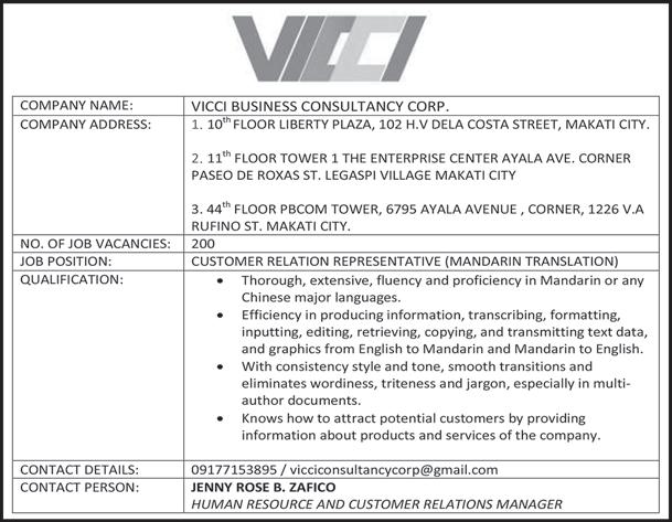 ESTABLISHMENT / ADDRESS No. NAME OF FOREIGN NATIONAL , POSITION AND BRIEF DESCRIPTION QUALIFICATION AND SALARY RANGE ESTABLISHMENT / ADDRESS No. NAME OF FOREIGN NATIONAL POSITION AND BRIEF DESCRIPTION QUALIFICATION AND SALARY RANGE ESTABLISHMENT / ADDRESS No. NAME OF FOREIGN NATIONAL , POSITION AND BRIEF DESCRIPTION QUALIFICATION AND SALARY RANGE 88. DOAN MINH TUONG Customer Service Representative Brief Job Description: Supports customers by providing helpful information, answering questions, and responding to complaints. Basic Qualification: College graduate/ level, preferably with customer service or sales experience, and fluent in Mandarin and basic English. Salary Range: Php 30,000 - Php 59,999 89. LE THI HUYEN Customer Service Representative Brief Job Description: Supports customers by providing helpful information, answering questions, and responding to complaints. Basic Qualification: College graduate/ level, preferably with customer service or sales experience, and fluent in Mandarin and basic English. Salary Range: Php 30,000 - Php 59,999 90. LE, VINH QUANG Customer Service Representative Brief Job Description: Supports customers by providing helpful information, answering questions, and responding to complaints. Basic Qualification: College graduate/ level, preferably with customer service or sales experience, and fluent in Mandarin and basic English. Salary Range: Php 30,000 - Php 59,999 91. LY THI TUOI Customer Service Representative Brief Job Description: Supports customers by providing helpful information, answering questions, and responding to complaints. Basic Qualification: College graduate/ level, preferably with customer service or sales experience, and fluent in Mandarin and basic English. Salary Range: Php 30,000 - Php 59,999 92. NGUYEN HUY DUNG Customer Service Representative Brief Job Description: Supports customers by providing helpful information, answering questions, and responding to complaints. Basic Qualification: College graduate/ level, preferably with customer service or sales experience, and fluent in Mandarin and basic English. Salary Range: Php 30,000 - Php 59,999 93. NGUYEN, HONG HANH Customer Service Representative Brief Job Description: Supports customers by providing helpful information, answering questions, and responding to complaints. Basic Qualification: College graduate/ level, preferably with customer service or sales experience, and fluent in Mandarin and basic English. Salary Range: Php 30,000 - Php 59,999 94. NGYEN KIEU OANH Customer Service Representative Brief Job Description: Supports customers by providing helpful information, answering questions, and responding to complaints. Basic Qualification: College graduate/ level, preferably with customer service or sales experience, and fluent in Mandarin and basic English. Salary Range: Php 30,000 - Php 59,999 95. VONG NHIT SAU Customer Service Representative Brief Job Description: Supports customers by providing helpful information, answering questions, and responding to complaints. Basic Qualification: College graduate/ level, preferably with customer service or sales experience, and fluent in Mandarin and basic English. Salary Range: Php 30,000 - Php 59,999 96. LE LY HUYNH Vietnamese Customer Service Representative Brief Job Description: Managing incoming calls and customer service inquiries. Basic Qualification: Able to speak, read and write Chinese language. Salary Range: Php 30,000 - Php 59,999 NEO INCORPORATED North Tower Centrum Bldg., Aseana Avenue, Entertainment City, Baclaran, City Of Parañaque 97. SUN, DECHUN Chinese Speaking Admin Associate Brief Job Description: Responsible for providing overall administrative support to the team he/she will be assigned to. Basic Qualification: With at least 6 months of experience, and good in verbal and written communication. Salary Range: Php 30,000 - Php 59,999 98. CAO PHUONG MINH Chinese Speaking Business Development Associate Brief Job Description: End-to-end partner management from opening to closing sales. Basic Qualification: Have excellent verbal and written communication and able to organize their work using tools. Salary Range: Php 30,000 - Php 59,999 99. CHE, MENGLIN Chinese Speaking Business Development Associate Brief Job Description: End to end partner management from opening to closing sales. Basic Qualification: Have excellent verbal and written communication and able to organize their work using tools. Salary Range: Php 30,000 - Php 59,999 100. CHEN, HONGWEI Chinese Speaking Business Development Associate Brief Job Description: Identify and maintain new business opportunities and existing partners. Basic Qualification: With at least 6 months of experience, and good in verbal and written communication. Salary Range: Php 30,000 - Php 59,999 101. CHENG, MINYI Chinese Speaking Business Development Associate Brief Job Description: End-to-end partner management from opening to closing sales. Basic Qualification: Have excellent verbal and written communication and able to organize their work using tools. Salary Range: Php 30,000 - Php 59,999 102. CHU THI THANH TAM Chinese Speaking Business Development Associate Brief Job Description: Assist with drafting business plans, sales, pitches, presentations, reference material and other documents as required. Basic Qualification: Excellent written and verbal communication skills. With strong organization and project management skills. Salary Range: Php 30,000 - Php 59,999 103. DANG THANH TUAN Chinese Speaking Business Development Associate Brief Job Description: End-to-end partner management from opening to closing sales. Basic Qualification: Have excellent verbal and written communication and able to organize their work using tools. Salary Range: Php 30,000 - Php 59,999 104. DENG, XIANHUANG Chinese Speaking Business Development Associate Brief Job Description: Identify and maintain new business opportunities and existing partners. Basic Qualification: With at least 6 months of experience, an