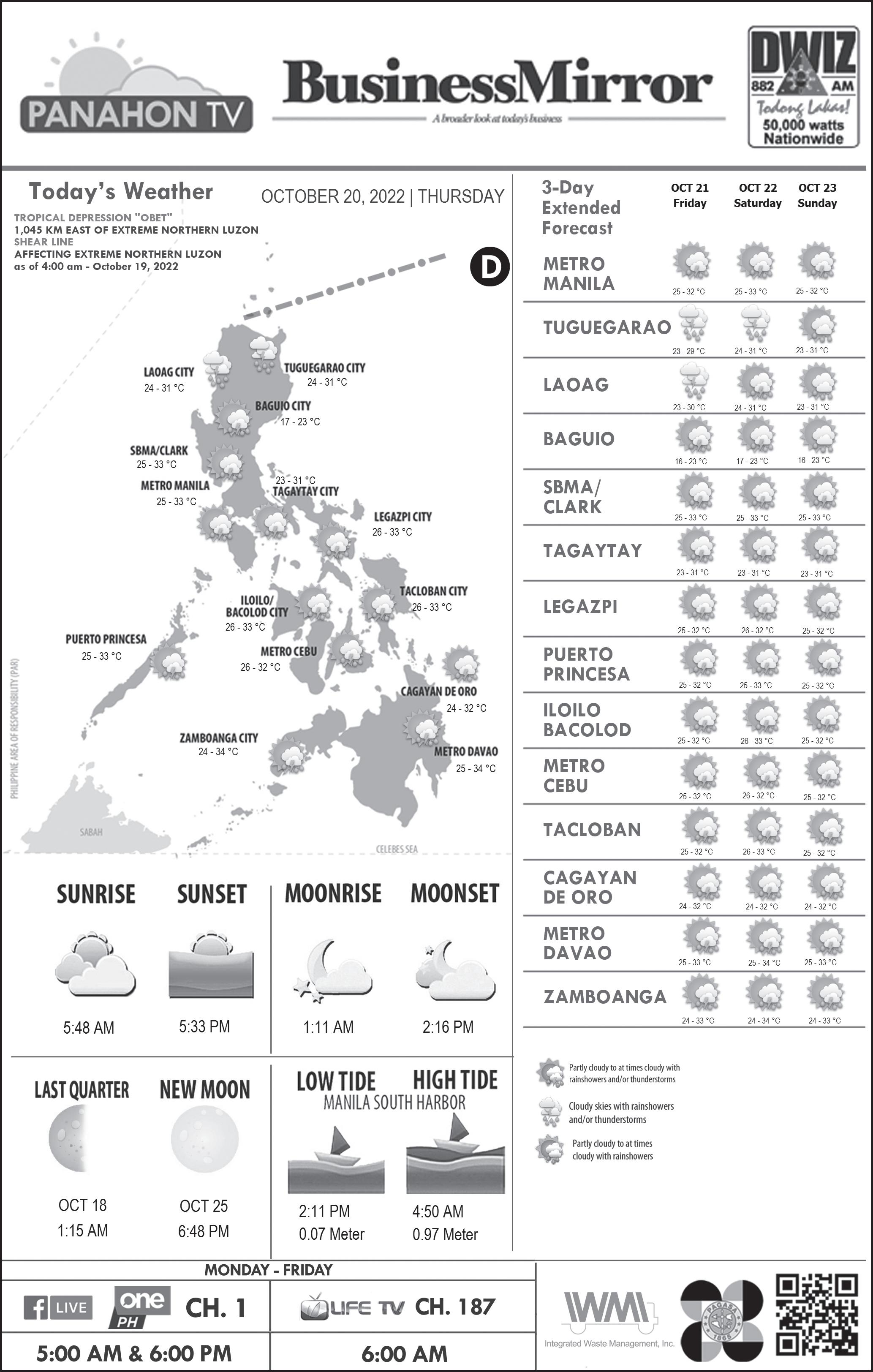 e PCCI unveiled a set of policy resolutions which it would submit to President Ferdinand R. Marcos Jr. during its 48th Philippine Business Conference and Expo (PBC&E), which kicked off on Wednesday. “Resolution urging the National Government to achieve food security by amending the Agrarian Reform Law to increase land retention limit from 5 to 24 hectares, implement a debt condonation program for unpaid amortizations of Agrarian Reform Beneficiaries, and convert Certificates of Land PESO EXCHANGE RATES US 58.9300 ■ JAPAN 0.3951 ■ UK 66.7559 ■ HK 7.5075 ■ SINGAPORE 41.4766 ■ AUSTRALIA 37.1907 ■ SAUDI ARABIA 15.6938 ■ EU 58.1286 ■ KOREA 0.0414 ■ CHINA 8.1874 Source: BSP (October 19, 2022) C A BusinessMirror A broader look at today’s business www.businessmirror.com.ph P. | | 7 DAYS A WEEK■ Thursday, October 20, 2022 Vol. 18 No. 8 ROTARY CLUB OF MANILA JOURNALISM AWARDS 2006 National Newspaper of the Year 2011 National Newspaper of the Year 2013 Business Newspaper of the Year 2017 Business Newspaper of the Year 2019 Business Newspaper of the Year 2021 Pro Patria Award PHILIPPINE STATISTICS AUTHORITY 2018 Data Champion EJAP JOURNALISM AWARDS BUSINESS NEWS SOURCE OF THE YEAR (2017, 2018, 2019, 2020) DEPARTMENT OF SCIENCE AND TECHNOLOGY 2018 BANTOG MEDIA AWARDS GOVT MUST FOCUS ON FOOD, ENERGY—PCCI ‘Delay