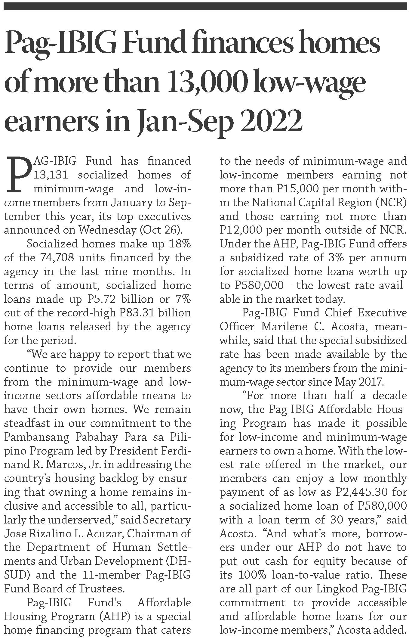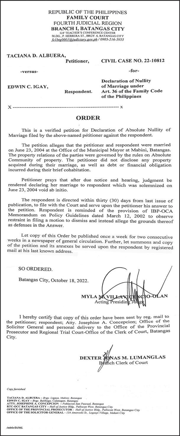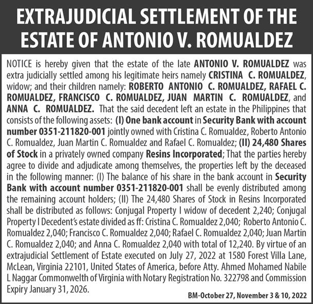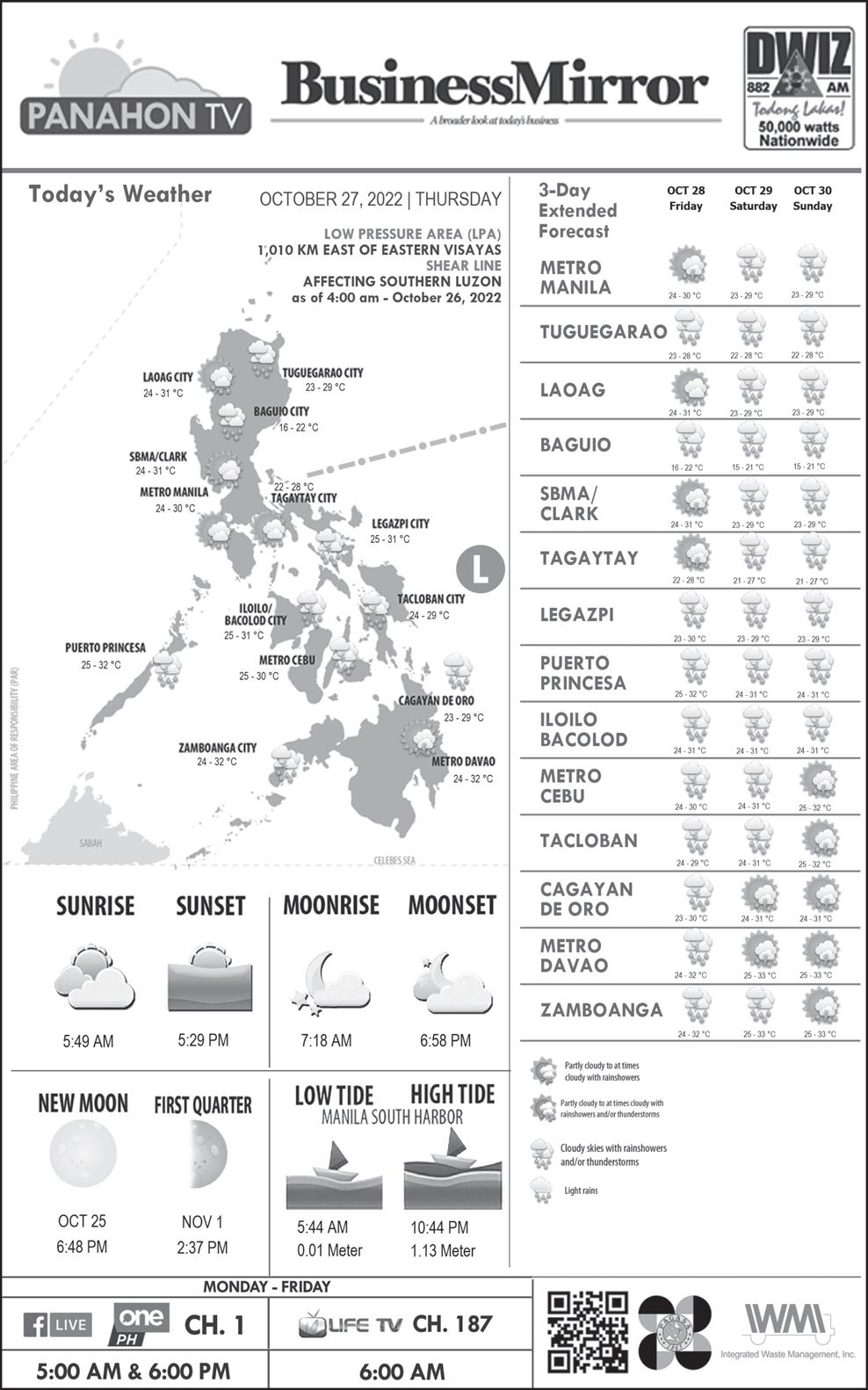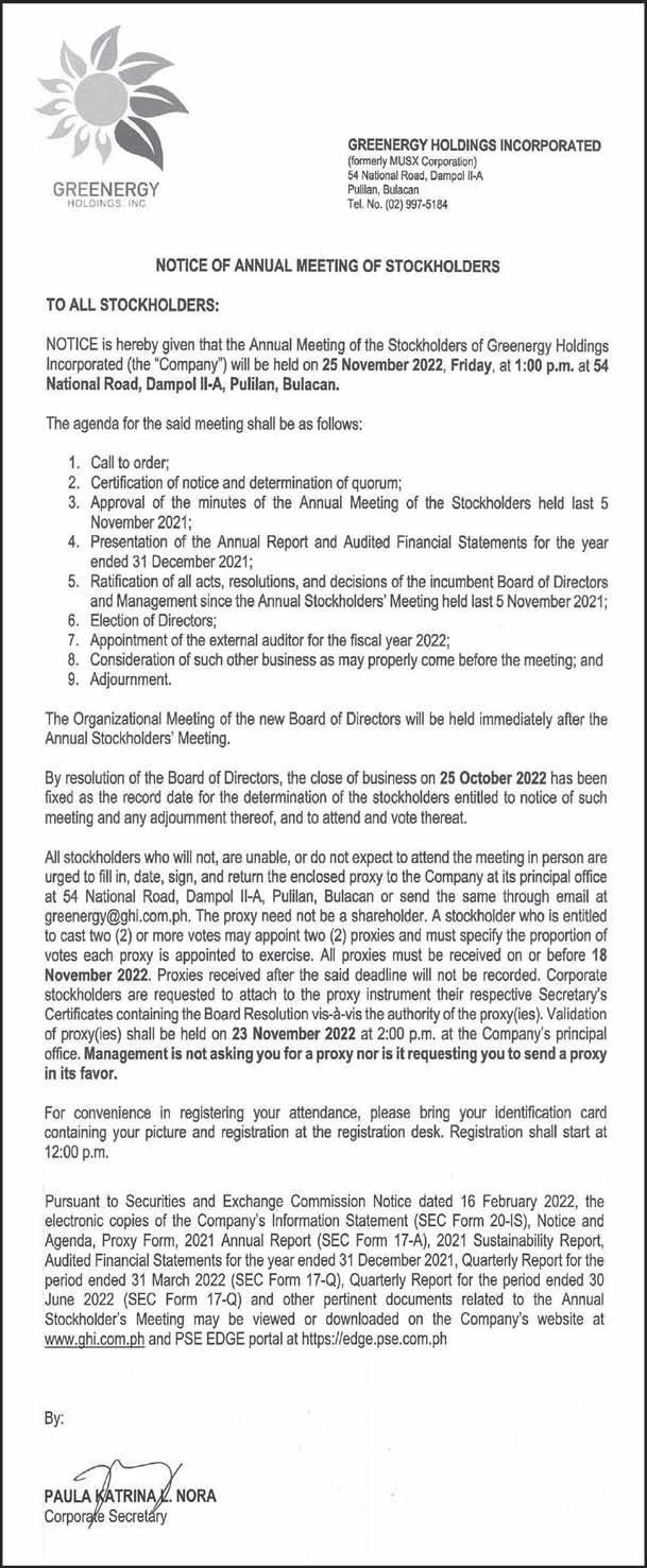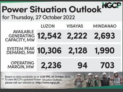PESO EXCHANGE RATES US 58.8240 ■ JAPAN 0.3973 ■ UK 67.4947 ■ HK 7.4940 ■ SINGAPORE 41.5365 ■ AUSTRALIA 37.5885 ■ SAUDI ARABIA 15.6530 ■ EU 58.6416 ■ KOREA 0.0412 ■ CHINA 8.0967 Source BSP (October 26, 2022) C A BusinessMirror A broader look at today’s business www.businessmirror.com.ph P. | | 7 DAYS A WEEK■ Thursday, October 27, 2022 Vol. 18 No. 15 ROTARY CLUB OF MANILA JOURNALISM AWARDS 2006 National Newspaper of the Year 2011 National Newspaper of the Year 2013 Business Newspaper of the Year 2017 Business Newspaper of the Year 2019 Business Newspaper of the Year 2021 Pro Patria Award PHILIPPINE STATISTICS AUTHORITY 2018 Data Champion EJAP JOURNALISM AWARDS BUSINESS NEWS SOURCE OF THE YEAR (2017, 2018, 2019, 2020) DEPARTMENT OF SCIENCE AND TECHNOLOGY 2018 BANTOG MEDIA AWARDS SEPT. BUDGET GAP DIPS AS REVENUE RISES 24.79% LABOR OF LOVE Aliah Barcelon, caretaker at the Manila Islamic Cemetery and Cultural Hall at the Manila South Cemetery, cleans the premises a few days before the nation marks All Saints’ Day and All Souls’ Day. Maintaining the cleanliness and orderliness of their cemetery is a yearlong job, she stresses, not just during “Undas.” And, while Muslims do not mark these two holidays as Christians do, the place is open for those who wish to visit their departed loved ones. NONIE REYES Cascolan role at DOH: Eye on syndicates, rightsizing UN envoy: Myanmar crisis deepens, taking ‘catastrophic toll on people’ WORLD | A12 Govt crafts natural wealth accounting system Imported stock keeps frozen pork inventory high S “C,” A S “I,” A S “G,” A B J E Y. A @jearcalas T