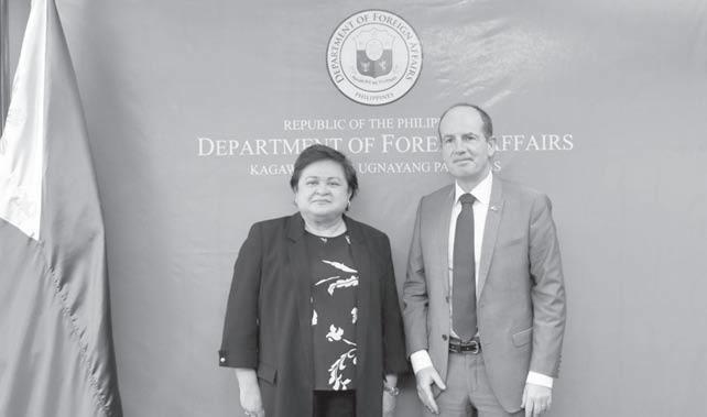 COOPERATION ON EDUCATION, ECONOMY Foreign Affairs Undersecretary Maria Theresa Lazaro met with Ireland’s Secretary General Joseph Hackett on October 19, where they highlighted the strong ties and cultural links between their two countries. Among topics discussed were economic and education cooperation, as well as the diaspora reality that both nations share. Lazaro expressed appreciation for the European country’s financial contribution to the United Nations Joint Program on Human Rights in the Philippines. Both sides agreed to enhance international cooperation, and expressed readiness to pursue stronger ties for common goals and aspirations. DFA-OPCD CAMILLE BARIZO