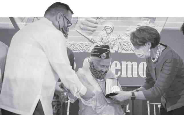AMBASSADOR MaryKay Carlson (right) leads the awarding of the Congressional Gold Medal to one of 31 Filipino World War 2 veterans. US EMBASSY