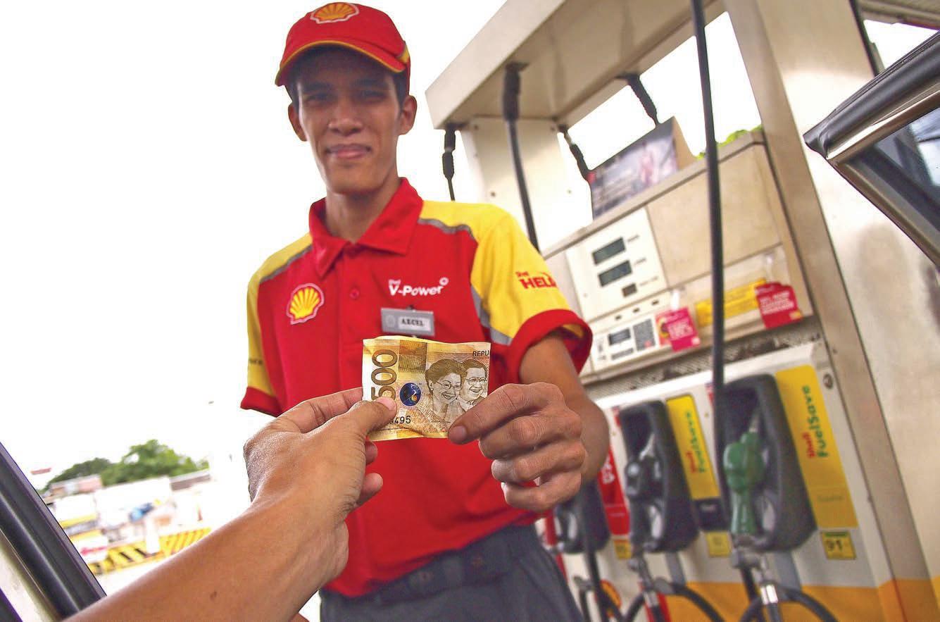 A GASOLINE station attendant receives payment from a customer in Angono, Rizal. JUNPINZON DREAMSTIME.COM