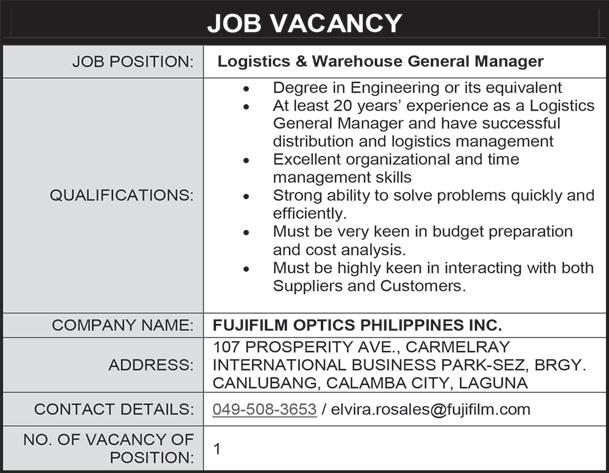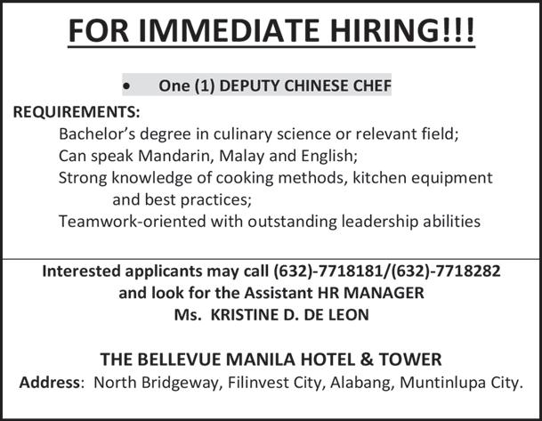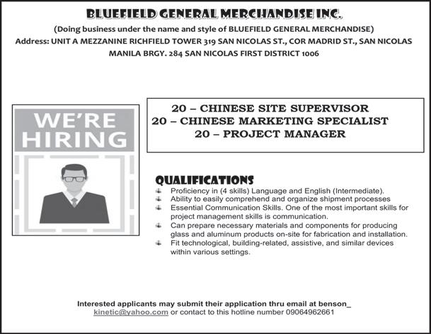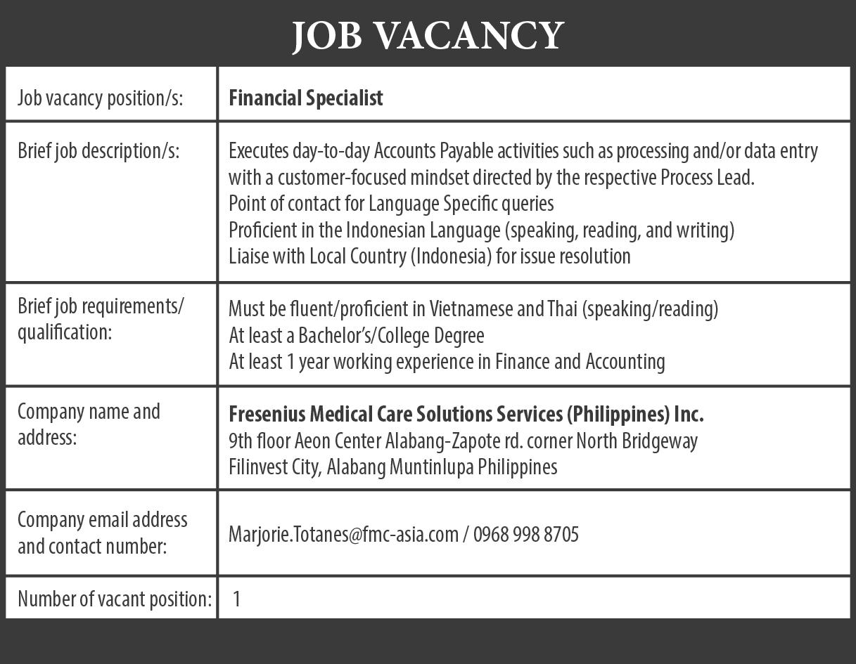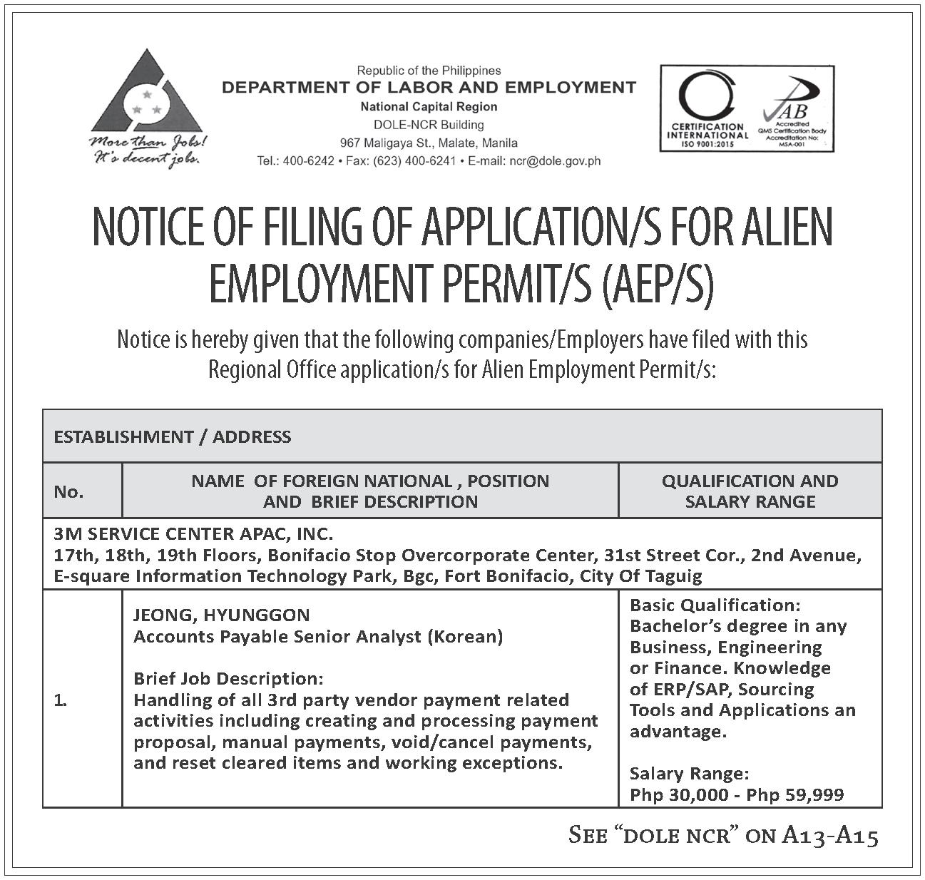 LI, YANG Mandarin Regional Manager Brief Job Description: Oversee the operations of multiple office, store or business branches. Guide, train and manage lower-level management and supervisors, though the use Mandarin native language, to senior professionals in China, Taiwan and other Mandarin speaking counterpart and clients. Basic Qualification: Bachelor degree in Business Management, Mandarin Speaking. Salary Range: Php 60,000 - Php 89,999 POWERCHINA B7 PHILIPPINES CORP. Unit 2101 21/f Bdo Equitable Bank Tower, 8751 Paseo De Roxas, Bel-air, City Of Makati 79. TIAN, DENGFENG Concrete Finisher Supervisor Brief Job Description: Overseeing all activities pertaining to concrete preparation, placement, installation, finishing and curing. Basic Qualification: Must know how to speak Mandarin. Salary Range: Php 30,000 - Php 59,999 80. TAO, ZHIHUA Site Supervisor Brief Job Description: Monitor progress of the projects and ensures compliance with safety regulations. Ensure smooth workflow and uphold safety guidelines. Basic Qualification: College graduate. Fluent in Chinese-Mandarin language. Salary Range: Php 30,000 - Php 59,999 81. PAN, AISHENG Technical Supervisor Brief Job Description: Check all the technical report from all the engineering department. Basic Qualification: Must know how to speak Mandarin. Salary Range: Php 30,000 - Php 59,999 PRIME ENERGY RESOURCES DEVELOPMENT B.V. 19/f Asian Star Bldg., Asean Drive, Alabang, City Of Muntinlupa 82. MINK, ROBERT JOHAN Senior Contract Leads Brief Job Description: Source, tender or negotiate, evaluate and award suppliers in close collaboration with the Project Team. Basic Qualification: College graduate. With in depth knowledge and previous work experience in the oil and gas industry. Salary Range: Php 90,000 - Php 149,999 RUNNINGMAN CORPORATION 8/f Techzone Bldg., 213 Sen. Gil Puyat Ave., San Antonio, City Of Makati 83. AUNG MYO KHANT Burmese-language Customer Support Staff Brief Job Description: Serves as primary contact for problem resolution and information gathering regarding customer complaints and work assignment. Basic Qualification: A native speaker of Burmese and fluent in English language (spoken and written). Salary Range: Php 60,000 - Php 89,999 SECURITY BANK CORPORATION Security Bank Centre Bldg., 6776 Ayala Avenue, San Lorenzo, City Of Makati 84. KULKARNI, SUHAS BHALCHANDRA Senior Assistant Vice President and Technology Delivery Manager Brief Job Description: The Senior Assistant Vice President and Technology Delivery Manager is an individual contributor within the CTO organization and reports to a Service Delivery Lead. Basic Qualification: A great leader, communicator, and team player with the ability influence and work effectively with the wide range of stakeholders from developer to executives. Salary Range: Php 500,000 and above SUYEN CORPORATION Bench Tower, 30th Street Corner Rizal Drive, Bonifacio Global City, Fort Bonifacio, City Of Taguig 85. DRAGOIU-LUCA, MARCELA Brand Marketing Consultant Brief Job Description: Researching in consumer markets, monitoring the latest market trends, and identifying all the potential areas a brand must invest in considering the spending habits and the needs of the customer. Basic Qualification: Must have a 10-year work experience in luxury brands; fluent in English, Italian, and Romanian (both speaking and writing); must be a graduate of BS marketing or its equivalent. Salary Range: Php 90,000 - Php 149,999 86. MAEZONO, HIROYUKI Corporate Planning Consultant Brief Job Description: Source and locate quantitative and qualitative data relevant to Philippine optometry and industry for inclusion in strategic business plans and external reporting documents to JINS Japan. Basic Qualification: Must have a 2-year work experience in JINS Japan; fluent in English and Japanese (both speaking and writing); must be a graduate of BS foreign language or studies or its equivalent. Salary Range: Php 150,000 - Php 499,999 TATA CONSULTANCY SERVICES (PHILIPPINES) INC. 8th-12th, 14th & 15th Floor, Panorama Tower, 34th Street Corner Lane A, Bonifacio Global City, Fort Bonifacio, City Of Taguig 87. DEVENDHIRAN, PRASANTH Analyst - Major Incident Management Brief Job Description: Responsible for taking care of major incident and service request management to restore the service and reduce impact to the customer environment service management SPOC for APAC region. Basic Qualification: Minimum of 8years of IT experience, working in developing applications using JAVA and Oracle; with experience in Unix, PL/SQI also knowledgeable to agile methodologies scrum. Salary Range: Php 150,000 - Php 499,999 TELEPHILIPPINES INCORPORATED Edsa Central It Center 2, United Street Corner Edsa, Greenfield District, City Of Mandaluyong 88. BANERJEE, KAUSHIK Director, IT Service Fulfillment Brief Job Description: Client satisfaction, customer success and Employee Satisfaction. Basic Qualification: With related work experience in the same field. Salary Range: Php 30,000 - Php 59,999 TIAN XIA TECHNOLOGIES INTERNATIONAL, INC. 6/f Filinvest Cyberzone Bldg. B, Superblock A Central Business Park 1 Bay City St., Barangay 76, Pasay City 89. SHAEH JIAN XUAN Malaysian IT Specialist Brief Job Description: Manages daily operations of the IT department. Basic Qualification: At least 19 years old Ability to speak, write, and communicate in their respective language. Salary Range: Php 30,000 - Php 59,999 TRANSCOM WORLDWIDE (PHILIPPINES), INC. Silver City 5, Office Lane, Ortigas East, Ugong, City Of Pasig 90. MINAMI, HIROAKI Bilingual Content Moderator (Japanese) Brief Job Description: Identify and address ambiguous situations for the client’s platform quality team to resolve and over communicate when issues or bugs arise, plus identify workflow improvements. Basic Qualification: College graduate. Japanese Language Advance Levelwritten and verbal communication skills. Proficient in English language. Salary Range: Php 90,000 - Php 149,999 WANFANG TECH