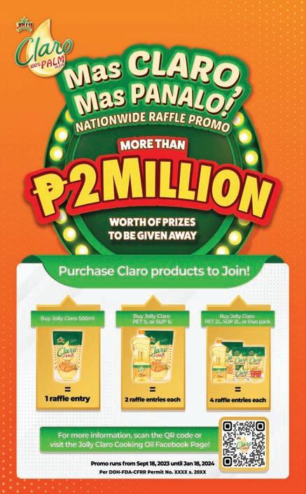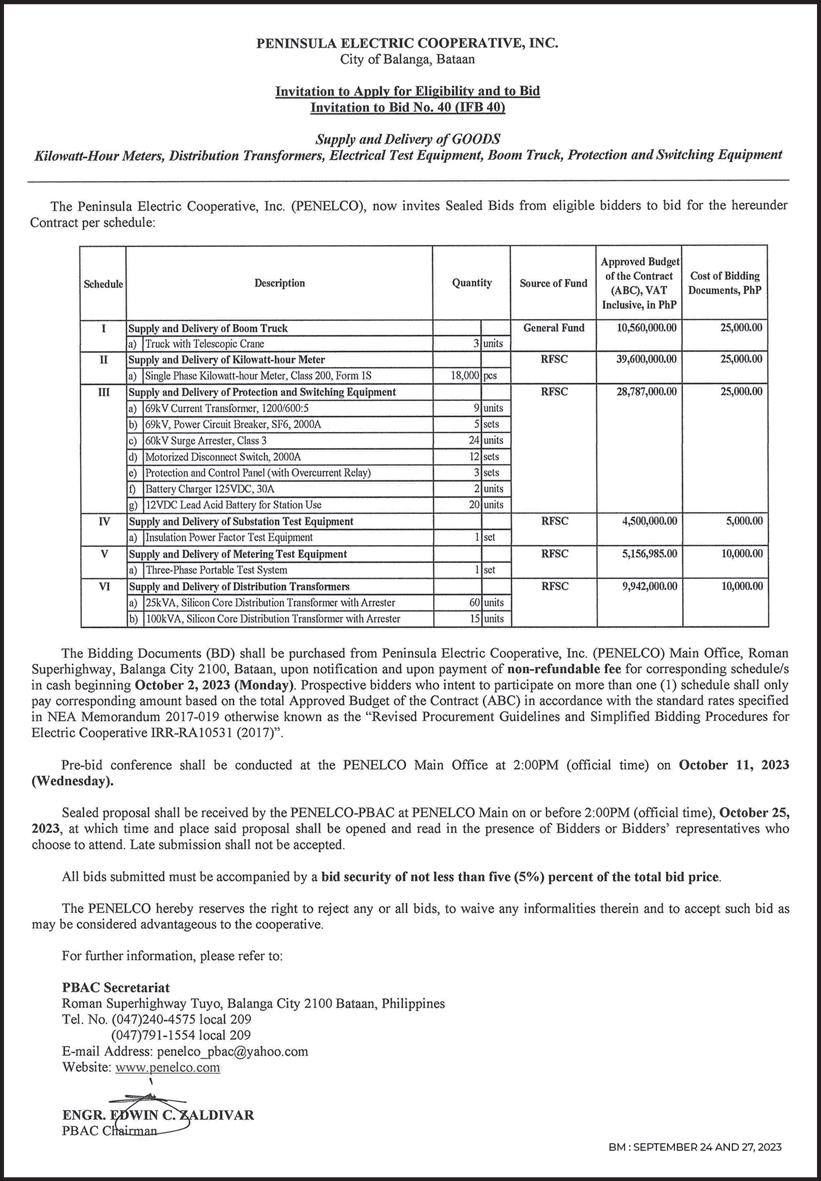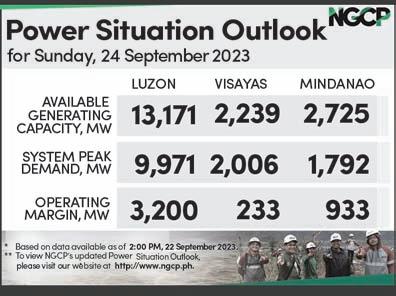 PESO EXCHANGE RATES n US 56.9080 n JAPAN 0.3857 n UK 69.9684 n HK 7.2766 n CHINA 7.7886 n SINGAPORE 41.6481 n AUSTRALIA 36.5008 n EU 60.6696 n KOREA 0.0425 n SAUDI ARABIA 15.1730 Source: BSP (September 22, 2023) Continued on A2 A broader look at today’s business EJAP JOURNALISM AWARDS BUSINESS NEWS SOURCE OF THE YEAR (2017, 2018, 2019, 2020, 2021) DEPARTMENT OF SCIENCE AND TECHNOLOGY 2018 BANTOG MEDIA AWARDS ROTARY CLUB OF MANILA JOURNALISM AWARDS 2006 National Newspaper of the Year 2011 National Newspaper of the Year 2013 Business Newspaper of the Year 2017 Business Newspaper of the Year 2019 Business Newspaper of the Year 2021 Pro Patria Award PHILIPPINE STATISTICS AUTHORITY 2018 Data Champion www.businessmirror.com.ph n Sunday, September 24, 2023 Vol. 18 No. 342 P25.00 nationwide | 4 sections 24 pages | 7 DAYS A WEEK