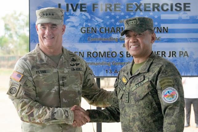 GEN. Charles Flynn, left, Commanding General USARPAC, shakes hands with Philippine Army Commanding Gen., Lt. Gen. Romeo Brawner during a “Balikatan” joint military exercise at Fort Magsaysay, Nueva Ecija, April 13, 2023. This year’s Balikatan exercises between the treaty allies are the largest since the two sides started joint military combat-readiness exercises in the early 1990s. AP/AARON FAVILA