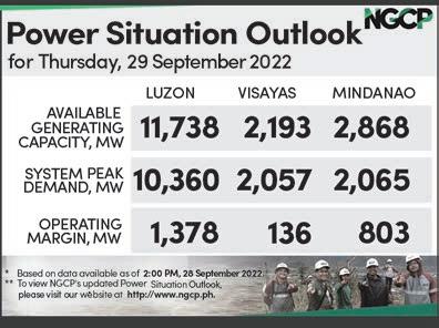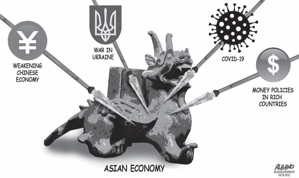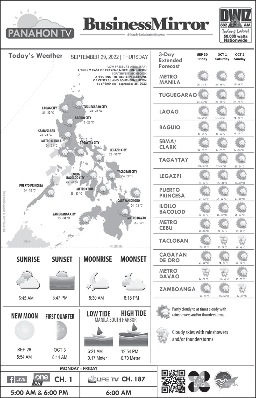 PESO EXCHANGE RATES US 58.9040 ■ JAPAN 0.4068 ■ UK 63.2217 ■ HK 7.5039 ■ SINGAPORE 40.9425 ■ AUSTRALIA 37.8812 ■ SAUDI ARABIA 15.6618 ■ EU 56.5361 ■ KOREA 0.0414 ■ CHINA 8.2039 Source: BSP (September 28, 2022) C A BusinessMirror A broader look at today’s business www.businessmirror.com.ph P. | | 7 DAYS A WEEK■ Thursday, September 29, 2022 Vol. 17 No. 356 ROTARY CLUB OF MANILA JOURNALISM AWARDS 2006 National Newspaper of the Year 2011 National Newspaper of the Year 2013 Business Newspaper of the Year 2017 Business Newspaper of the Year 2019 Business Newspaper of the Year 2021 Pro Patria Award PHILIPPINE STATISTICS AUTHORITY 2018 Data Champion EJAP JOURNALISM AWARDS BUSINESS NEWS SOURCE OF THE YEAR (2017, 2018, 2019, 2020) DEPARTMENT OF SCIENCE AND TECHNOLOGY 2018 BANTOG MEDIA AWARDS HOUSE OKAYS P5.268-T BUDGET FOR NEXT YEAR RESIDENTS give away onions and other vegetables along a flooded road due to Typhoon Karding (international code name Noru) in San Miguel, Bulacan, on Monday, September 26, 2022. Karding left at least eight dead when it pummeled the northern Philippines, including a group of five rescuers who drowned while trying to save villagers from rising floodwaters. It has now weakened into a tropical storm over central Vietnam on Wednesday, causing blackouts and blowing off roofs and billboards with strong winds and putting Thailand on alert for more floods and heavy rains. Story on Karding aftermath on A4. AP/AARON FAVILA S “Q,” A Q4 typhoons won’t impact inflation much, says ADB Over 194,000 Russian men flee call-up to neighboring countries WORLD | A11 US prods PHL on ‘restrictive’