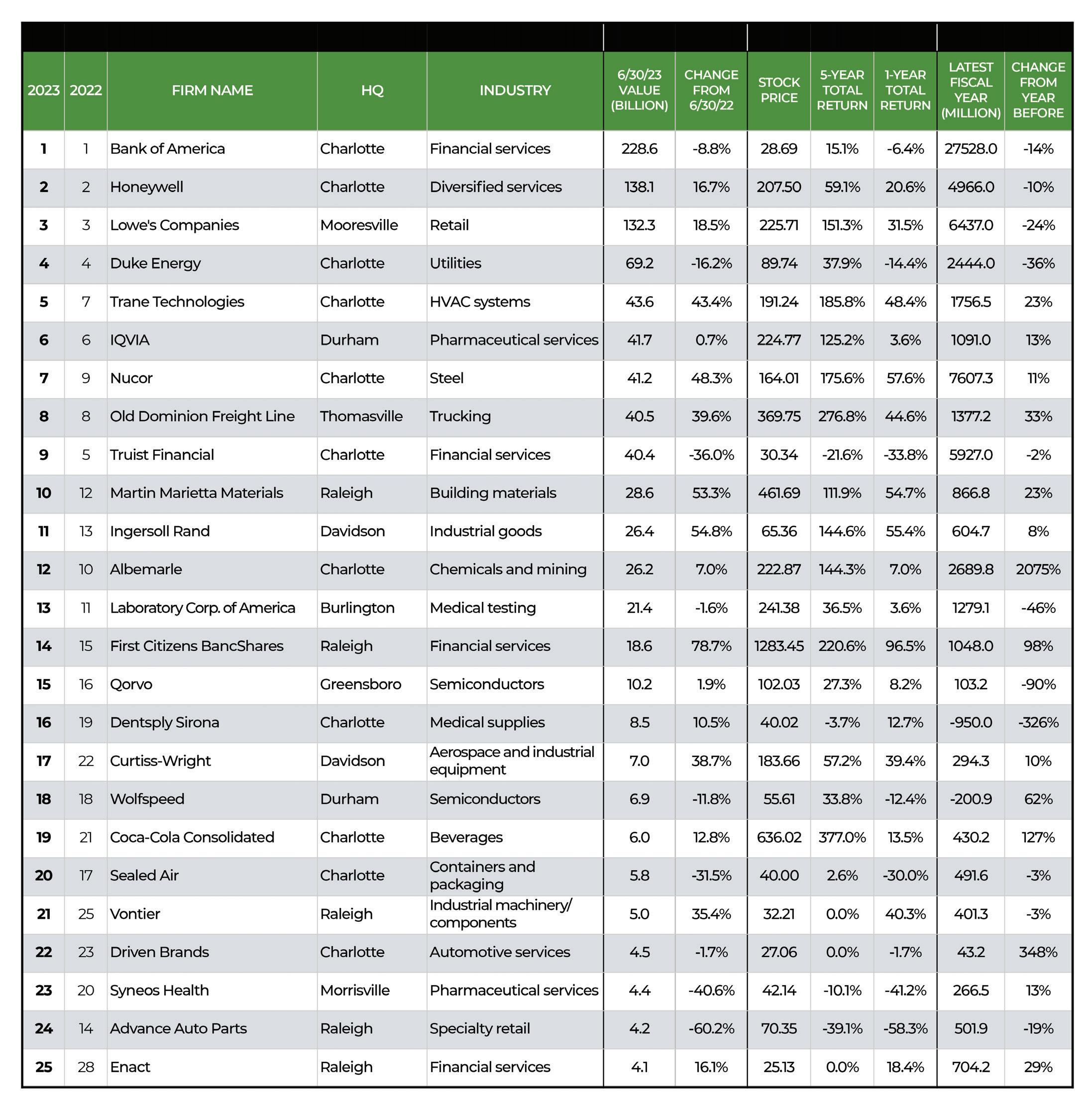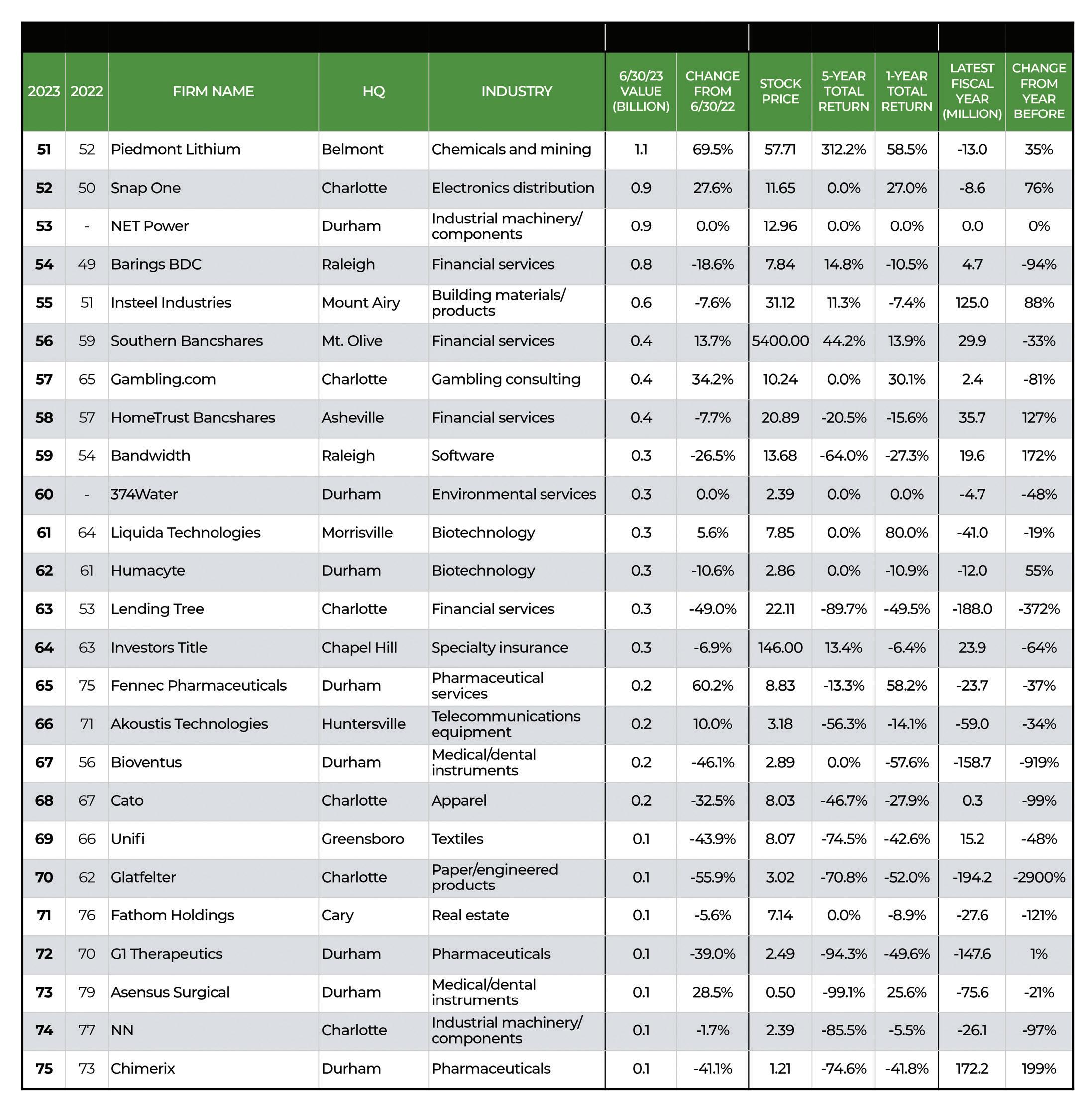 But BNC has always o ered an annual report card on the public companies based in the state. Our report starting on Page 48 shows that, indeed, there are a few N.C. companies that have shown consistent success over the past ve years.