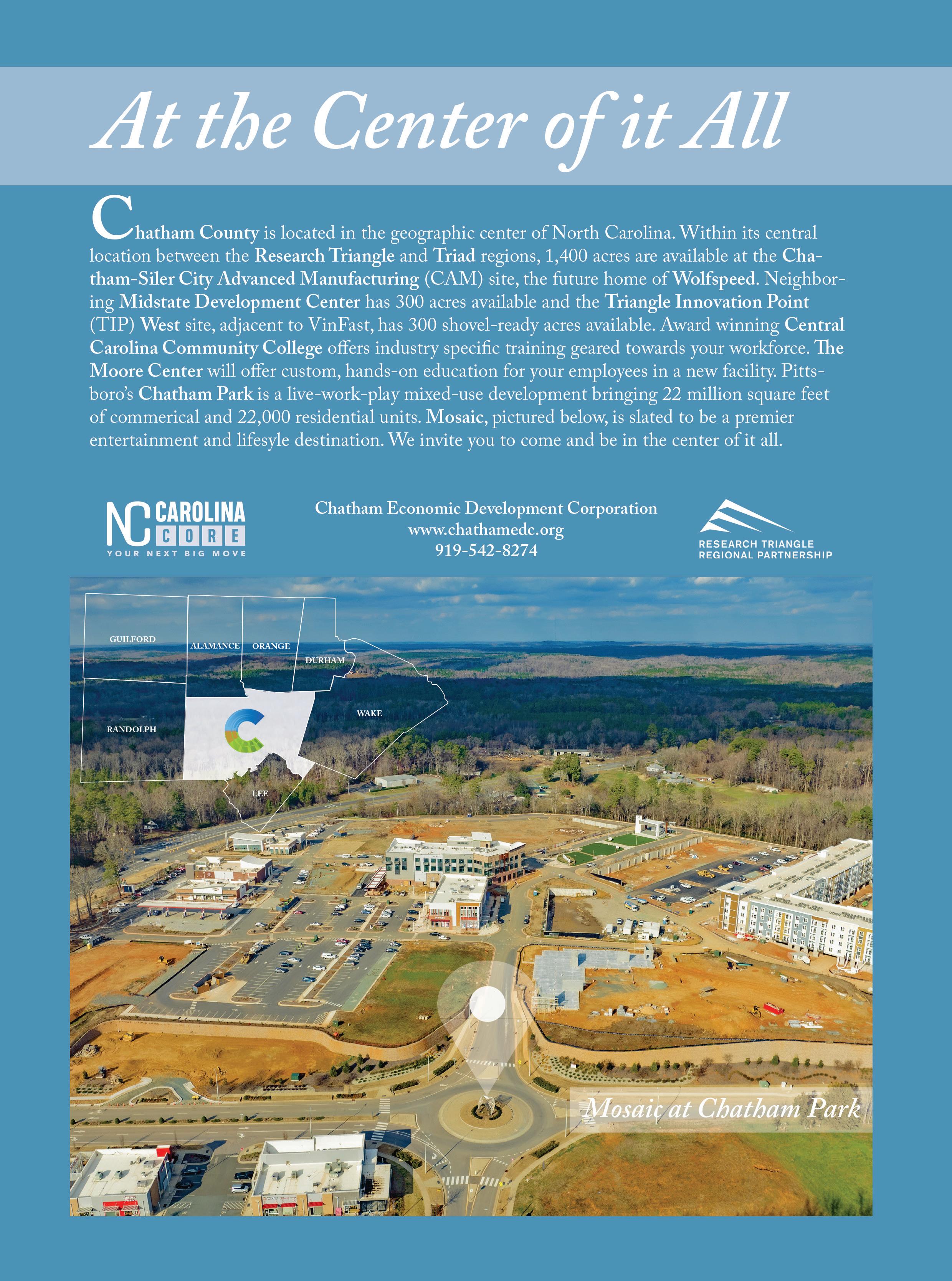 And that’s a prime example of industry and quality of life coming together. Education and workforce are key to attracting business, of course, as well as location, transportation, investment incentives, and many other components. But Chatham County’s distinct quality of life is an important draw, too. The mostly rural county has proximity to the urban downtowns of Raleigh and Greensboro, and offers its own small town charm, as well.