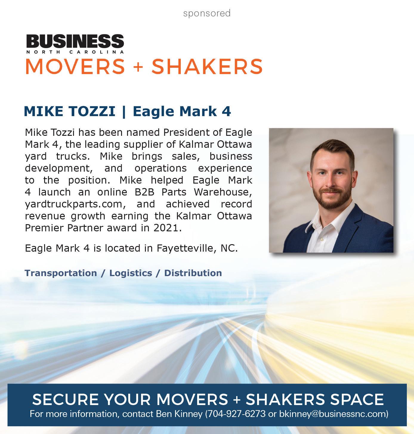 3 FEBRUARY 2023 February 2023, Vol. 43, No. 2 (ISSN 0279-4276). Business North Carolina is published monthly by Business North Carolina at 1230 West Morehead Street, Suite 308, Charlotte, NC 28208. Phone: 704-523-6987. Fax: 704-523-4211. All contents copyright © by Old North State Magazines LLC. Subscription rate: 1 year, $30. For change of address, send mailing label and allow six to eight weeks. Periodicals postage paid at Charlotte, NC, and additional offices. POSTMASTER: Send address changes to BUSINESS NORTH CAROLINA, 1230 West Morehead Street, Suite 308, Charlotte, NC 28208 or email circulation@businessnc.com. COVER PHOTO BY BERT VANDERVEEN Start your day with business news from across the state, direct to your inbox. SIGN UP AT BUSINESSNC.COM/DAILY-DIGEST. + DEPARTMENTS