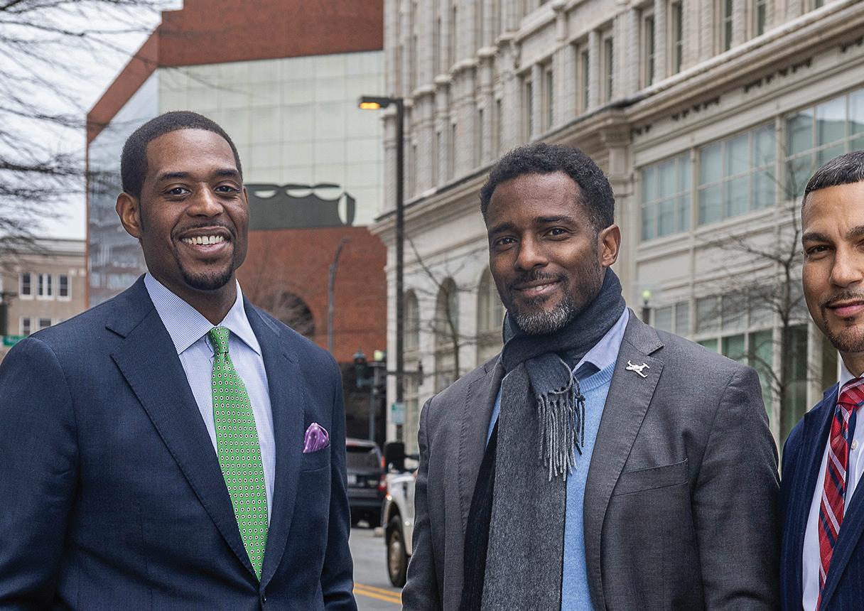 Everyone we’ve cited over the years is making an impact on their business or organization, while also playing key civic roles. Most have been folks who rarely receive media attention despite their considerable in uence. e importance of community is re ected in our cover photo. Lawyers Gerald Walden and Justin Outling and Jet It CEO Glenn Gonzales work within a block of each other in downtown Greensboro. But they were barely acquainted before Creative Director Peggy Knaack organized a photo shoot of the trio.