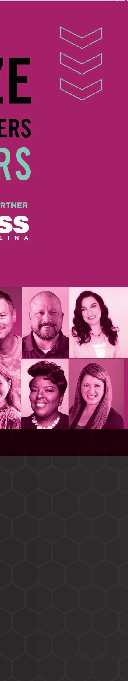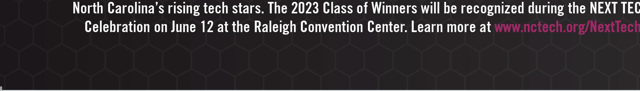 We are excited to share a new feature with you in this issue. BNC partnered with technology advocacy association NC TECH to launch the Next Tech Awards to showcase and celebrate North Carolina’s rising tech stars. Next Tech Awards honors a selection of individuals who are critical and exceptional performers helping to grow our state’s tech and tech-enabled companies and organizations. e focus is on those who are c-suite executives and o en aren’t recognized publicly. Individual winners, who are pro led on pages 52-59, will be celebrated during a reception on June 12 at the Raleigh Convention Center.