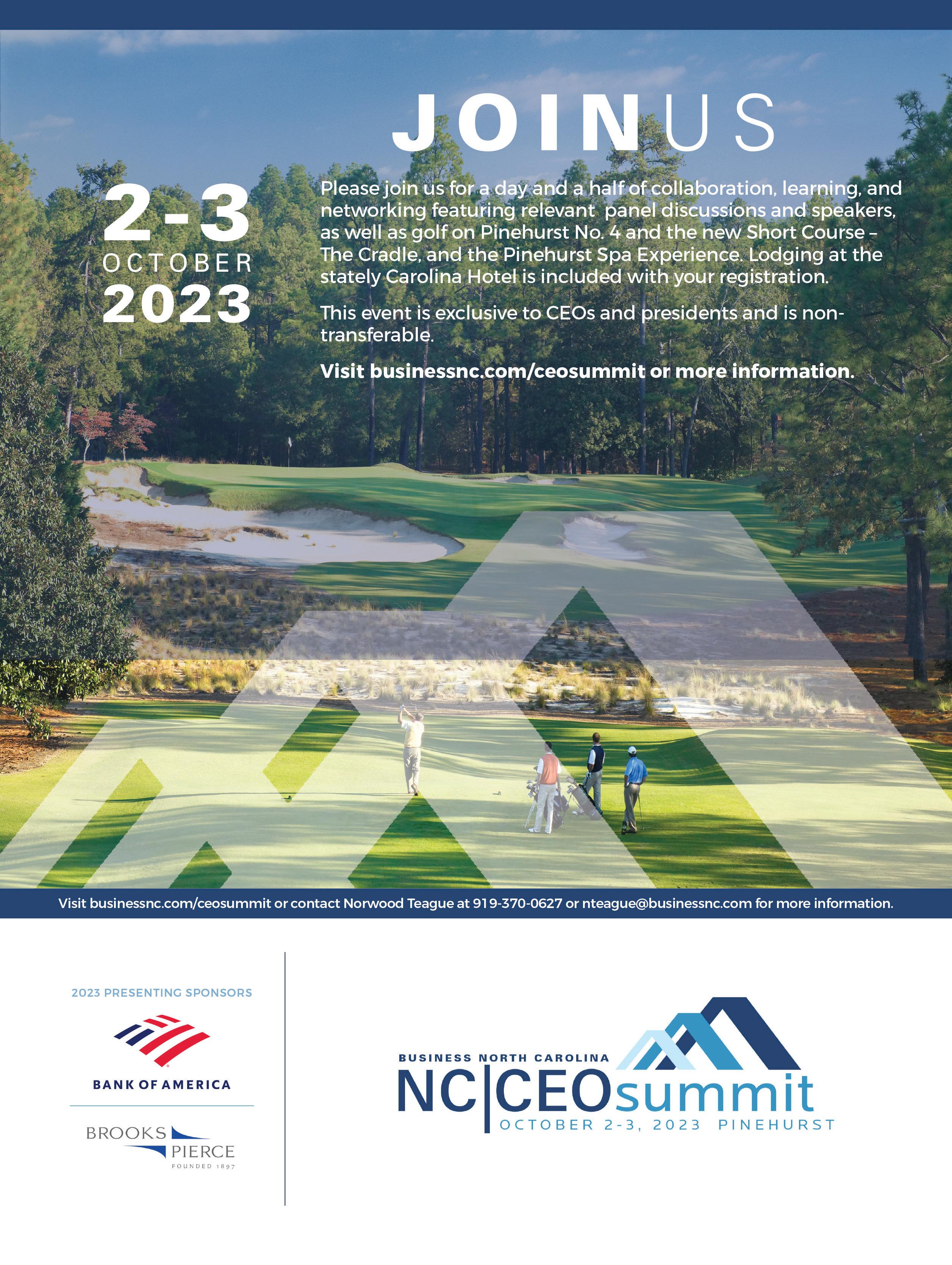 3 JUNE 2023 June 2023, Vol. 43, No. 6 (ISSN 0279-4276). Business North Carolina is published monthly by Business North Carolina at 1230 West Morehead Street, Suite 308, Charlotte, NC 28208. Phone: 704-523-6987. All contents copyright © by Old North State Magazines LLC. Subscription rate: 1 year, $30. For change of address, send mailing label and allow six to eight weeks. Periodicals postage paid at Charlotte, NC, and additional offices. POSTMASTER: Send address changes to Business North Carolina, 1230 West Morehead Street, Suite 308, Charlotte, NC 28208 or email circulation@businessnc.com. Start your day with business news from across the state, direct to your inbox. SIGN UP AT BUSINESSNC.COM/DAILY-DIGEST.