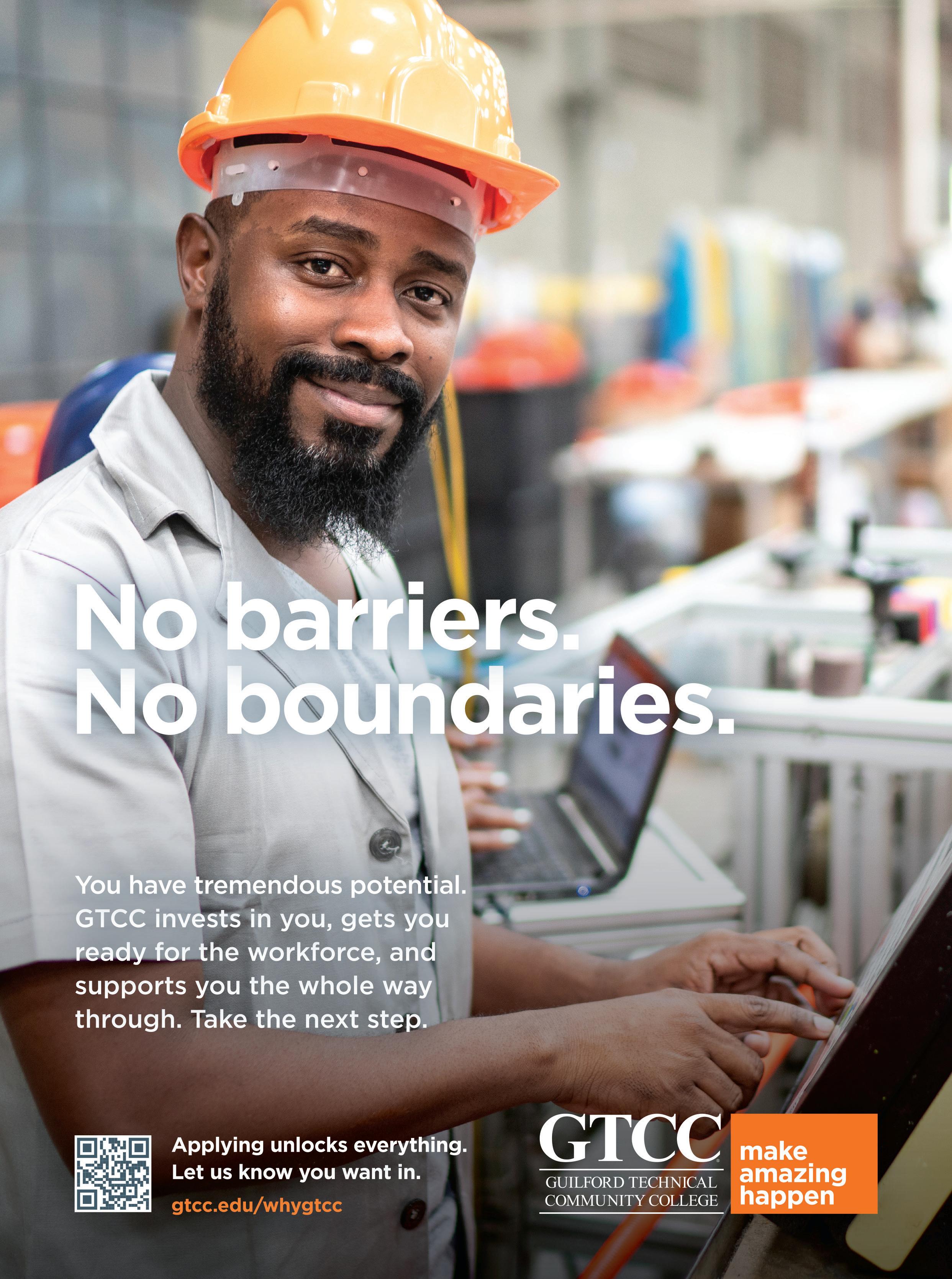 GTCC meets twice annually with local employers in several industries. “We are definitely out there in the community with employers to see how we can help prepare new employees and upscale current employees,” Clarke says. “Yes, there are great jobs, but people aren’t just going to show up. You have to recruit, sell your message, let students know, let parents know. We work with Guilford County Schools to let students know of all the possibilities when they graduate. It’s a work in progress. There’s more to do.