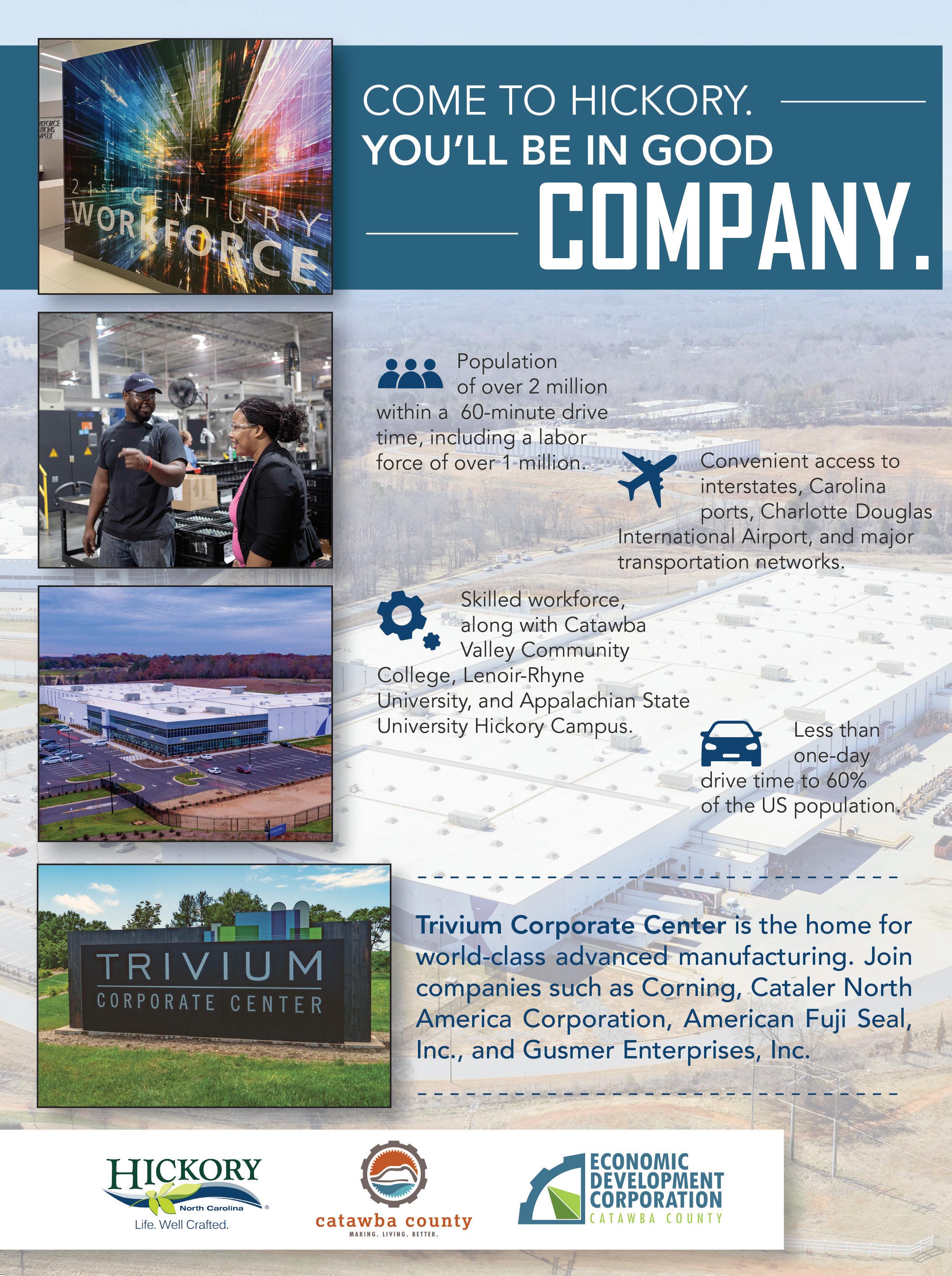 Head west from Wilson County, and you’ll find Catawba County. Scott Millar is president of the county’s economic development corporation, and he’s seen ups and downs over the last three decades. While furniture and textile manufacturing has contracted since their heyday in the 1990s, some companies continue, including Hickorybased Sherrill’s Furniture, a familyowned manufacturer since 1945. “We had lost 45,000 jobs by 2002, when we thought our manufacturing base was rock solid,” he says. “We had to look toward diversification.”