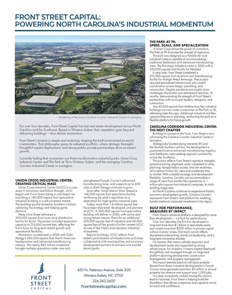 Aerospace Corridor has successfully transitioned from traditional tobacco and textile clusters to thriving sectors such as aerospace, food, housing, biotech and pharmaceuticals,” he says. “Its central location enables one-day trucking service to major metropolitan markets, including Atlanta, Baltimore, New York and Philadelphia. Two-day motor freight access extends deep into the Northeast, Midwest and Southeast, connecting the corridor with key cities such as Boston, Miami, Chicago and Pittsburgh.”