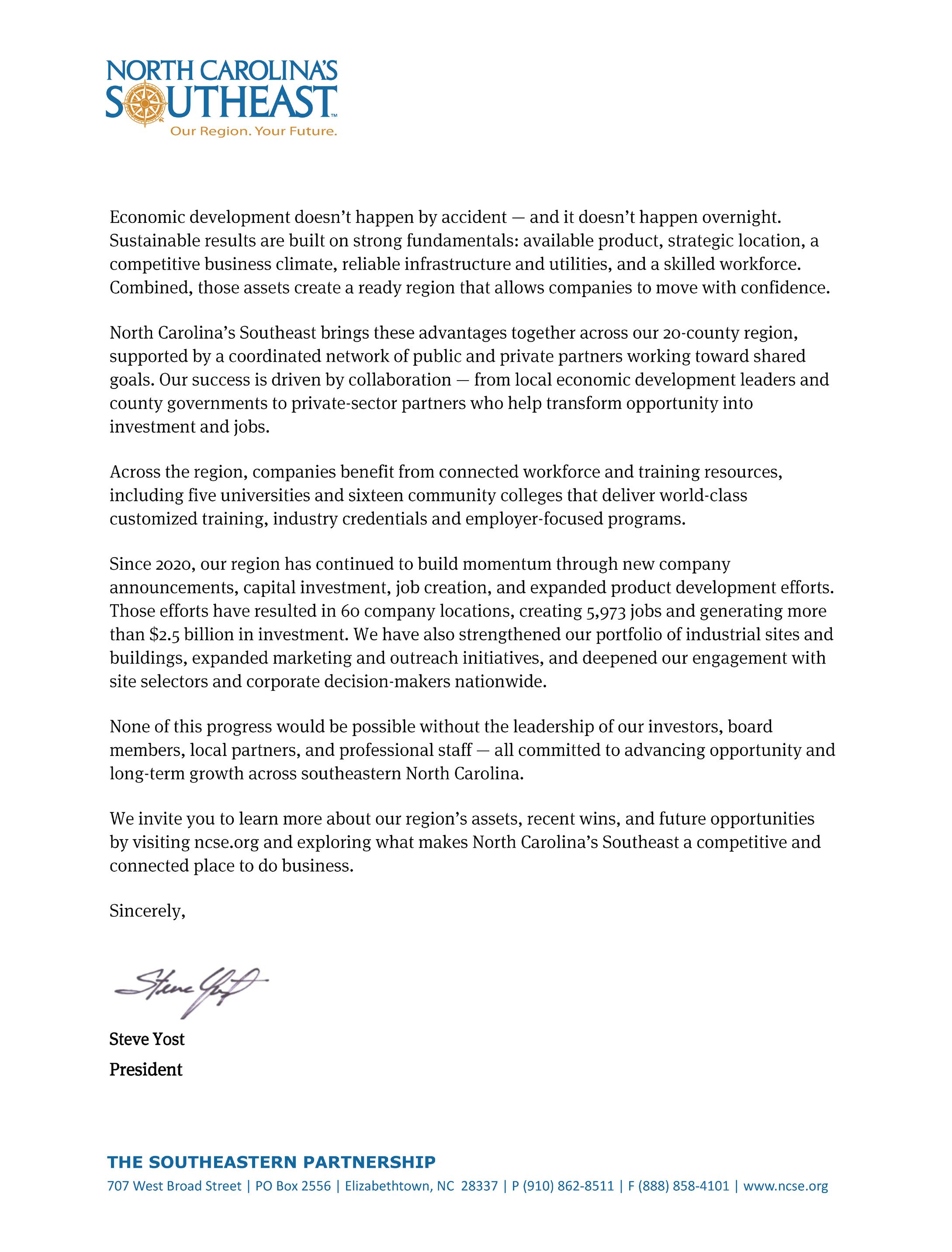 Changes to southeastern North Carolina’s economy are taking root. “We have a three-year Strategic Plan that we follow, the latest of which laid out our plans and goals from 2024 to 2027,” Yost says. “We’re following that to a T, and so far, everything is going well. After a strong fiscal year that started in July 2024, we’ve already met our goal for investment, which was $415 million. We’re also more than halfway to meeting our goal of generating 2,000 jobs. The current fiscal year has been going well, too, so we hope to knock those goals out of the park entirely by 2027.”■