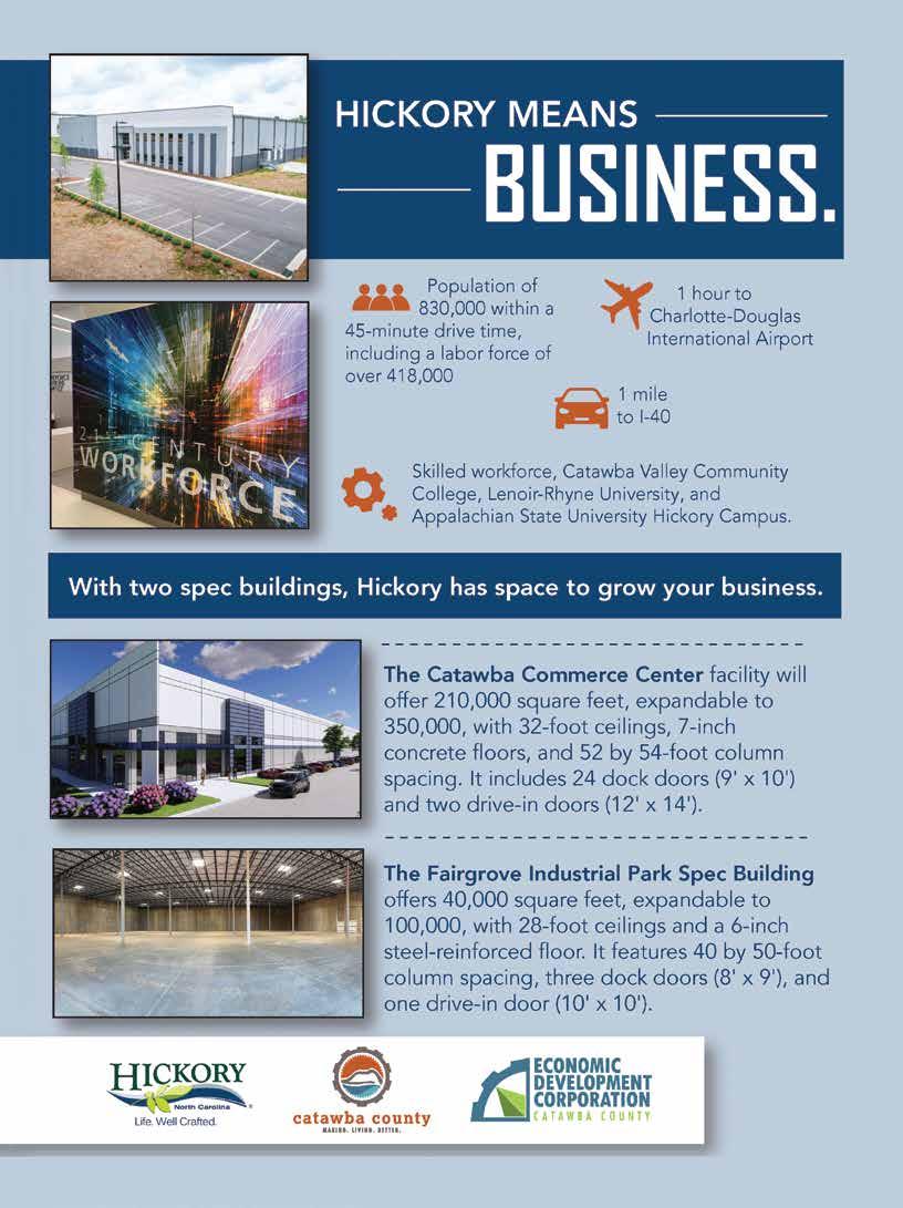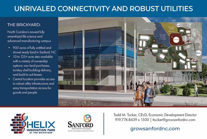 Halifax County is about halfway between New York and Florida. It’s bisected by Interstate 95 and is a 90-minute drive from international airports in Raleigh-Durham and Norfolk and Richmond in Virginia. CSX provides rail service, and the ports of Norfolk, Virginia, Morehead City and Wilmington are nearby. There’s a multimodal facility in Rocky Mount, about 45 miles south of Roanoke Rapids, the county’s mostpopulous city. It also is home to the U.S. 301 Industrial Site in Enfield, part of the Selectsite program.