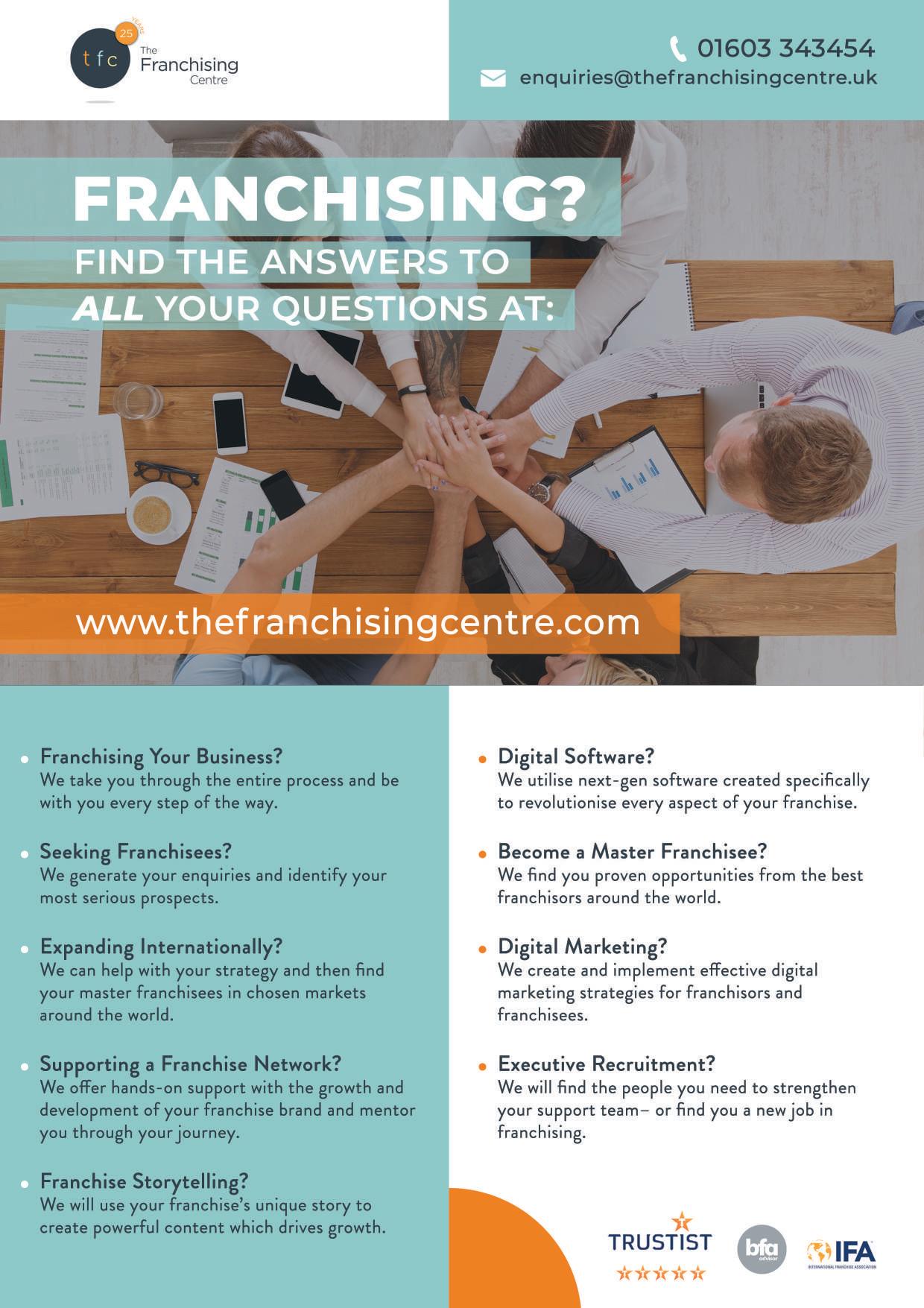 Franchise Ready has been operating since January 2012, every team member has been working in the franchise sector and collectively we have over 300 years of Franchising experience operating in every function and level within a franchise organisation and across more than 30 franchise systems, this coupled with the work we have done in developing over 200 franchise brands globally gives Franchise Ready more experience than any other franchise consulting brand in the UK.