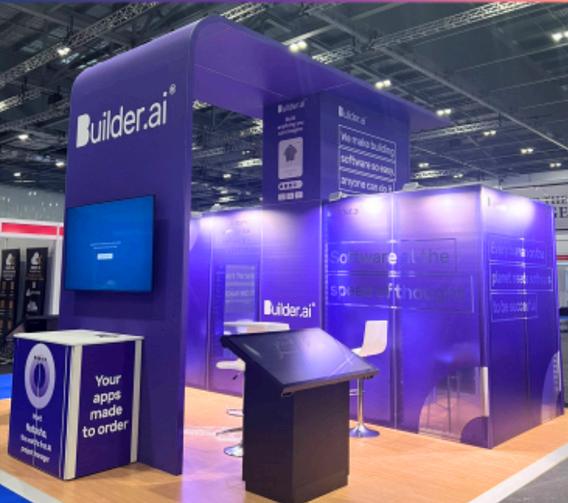 A fully carpeted exhibition space featuring a blank fabric backdrop which you can utilise for graphics. Also includes displayed company name banner.