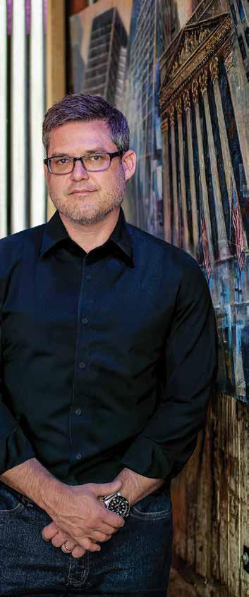 Originally from Boonville, Webster is known for his use of di erent mediums — including oil paint, acrylic paint, and mixed media — and his work frequently highlights architecture and technical structures. He enjoys using texture, color, and di erent materials to illustrate the places he’s been and the way he sees those places. Webster chooses the materials to create a piece based on the mood he’s trying to create.