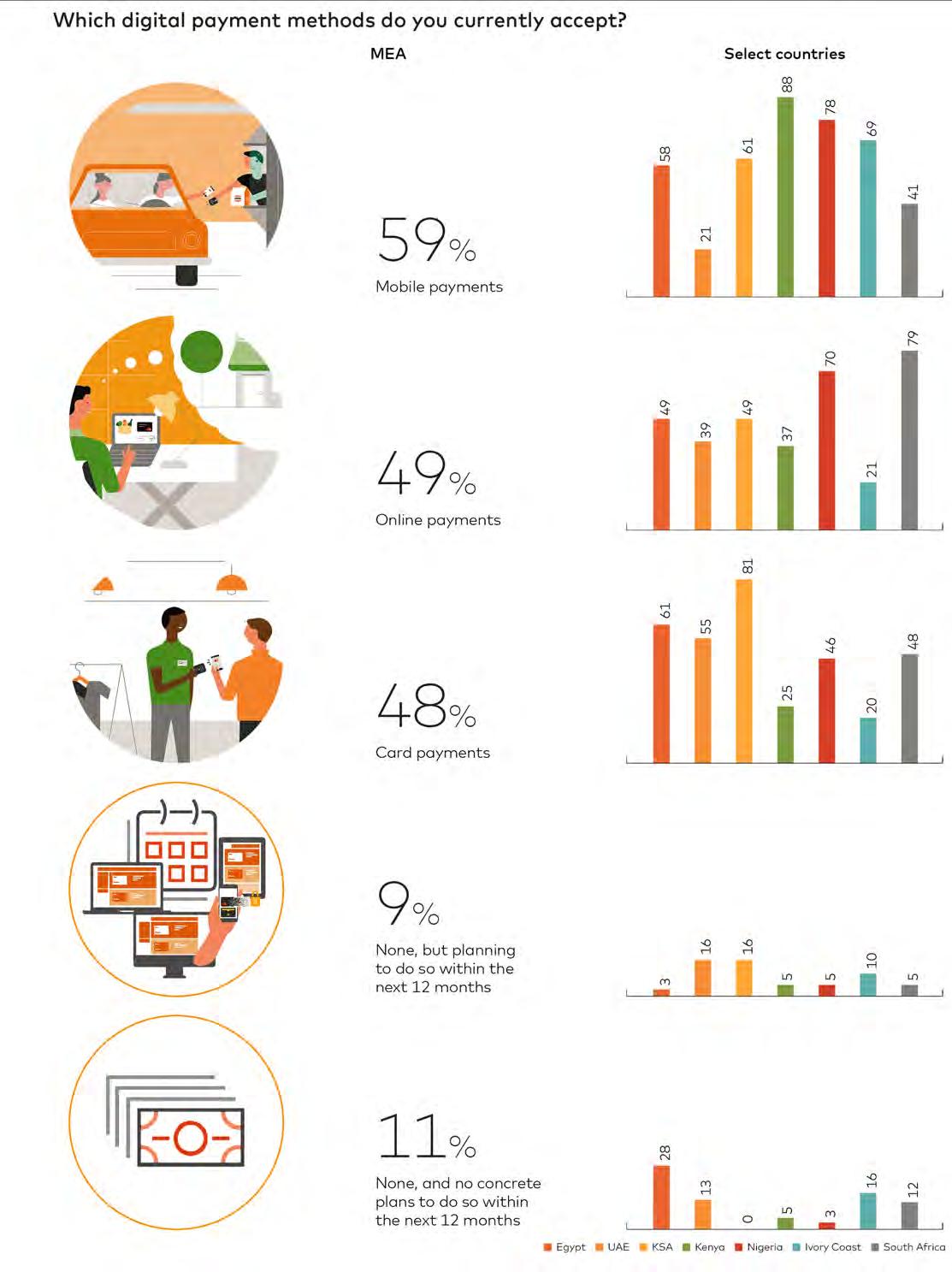 digital payment methods used by MEA SMEs include mobile 59%, online 49%, cards 48%
