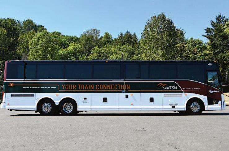 T h e Wa s h i n g t o n D e p a r t m e n t o f Tr a n spor tation (WSDOT) and Amtrak are replacing a diesel-powered bus with an electric vehicle (EV) on the Amtrak Cascades route Daily mid-day buses provide additional connectivity beyond the mor ning and evening train service between Seattle and Bellingh a m T h e C a s c a d e s T h r u w a y b u s e s a l s o stop in Everett and Mount Ver non and connect with trains heading to and from stations south of Seattle As the first-ever EV in the Amtrak National Network, the bus – owned and operated by MTRWester n – can make the nearly 200-mile roundtrip on one single charge
