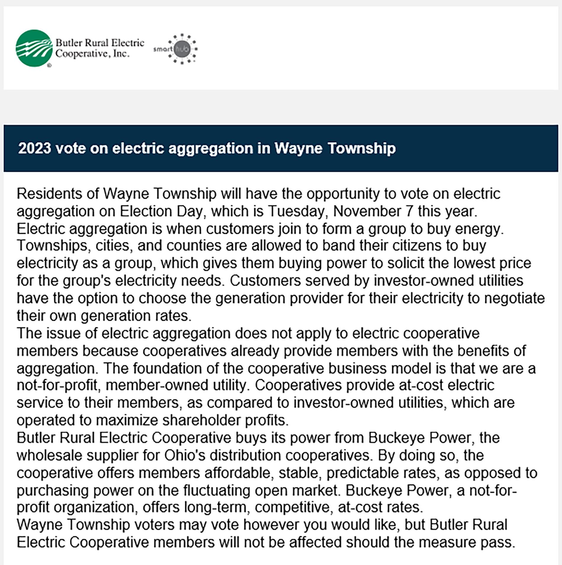 We sent the notices below by mail and email to members in Ross, Milford, Oxford, Reily, and Wayne townships the week of October 2. Please read the notice to learn more about electric aggregation and why the issue does not apply to co-op members.