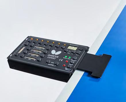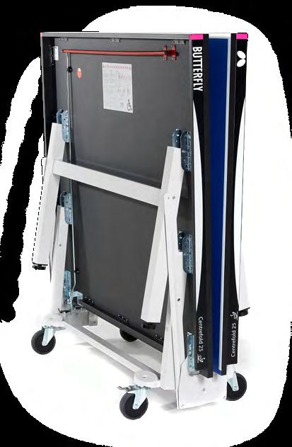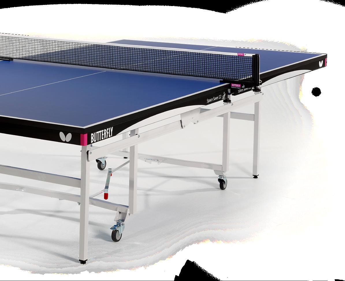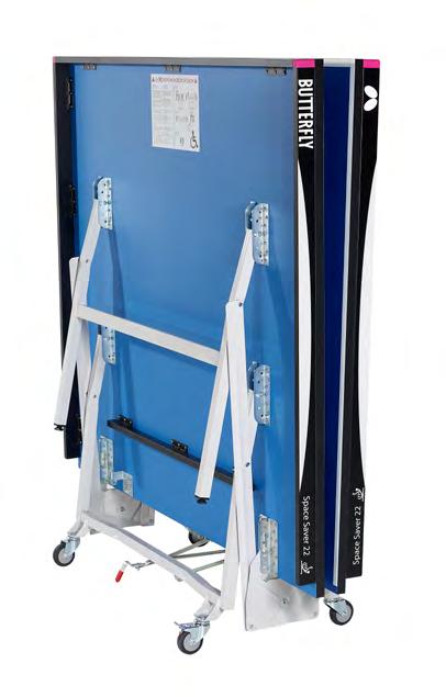 Die 22 mm Oberfläche bieten sehr gute Spieleigenschaften. Das Metallgestell mit vier Rollen – davon zwei mit Feststellbremsen ² – liefert die nötige Stabilität und ermöglicht in Parkstellung ein einfaches Rangieren. Die höhenverstellbaren Standbeine mit Drehfüßen ³ ermöglichen ein leichtes Nivellieren. Durch das innovative SC-System ¹ benötigt der Space Saver nur wenig Abstellfläche. Bereits 56 cm Tiefe genügen. Die Scherensicherung ⁴ verhindert ein unabsichtliches Aufklappen in der Spielstellung. Der Tisch trägt aufgrund der 400 mm Distanz zwischen Tischkante und Gestell das Prädikat rollstuhlgerecht. Butterfly Space Saver 22 ist durch die ITTF für den Wettkampfbetrieb zugelassen und besitzt das europäische Sicherheitszertifikat (EN 14468-1).