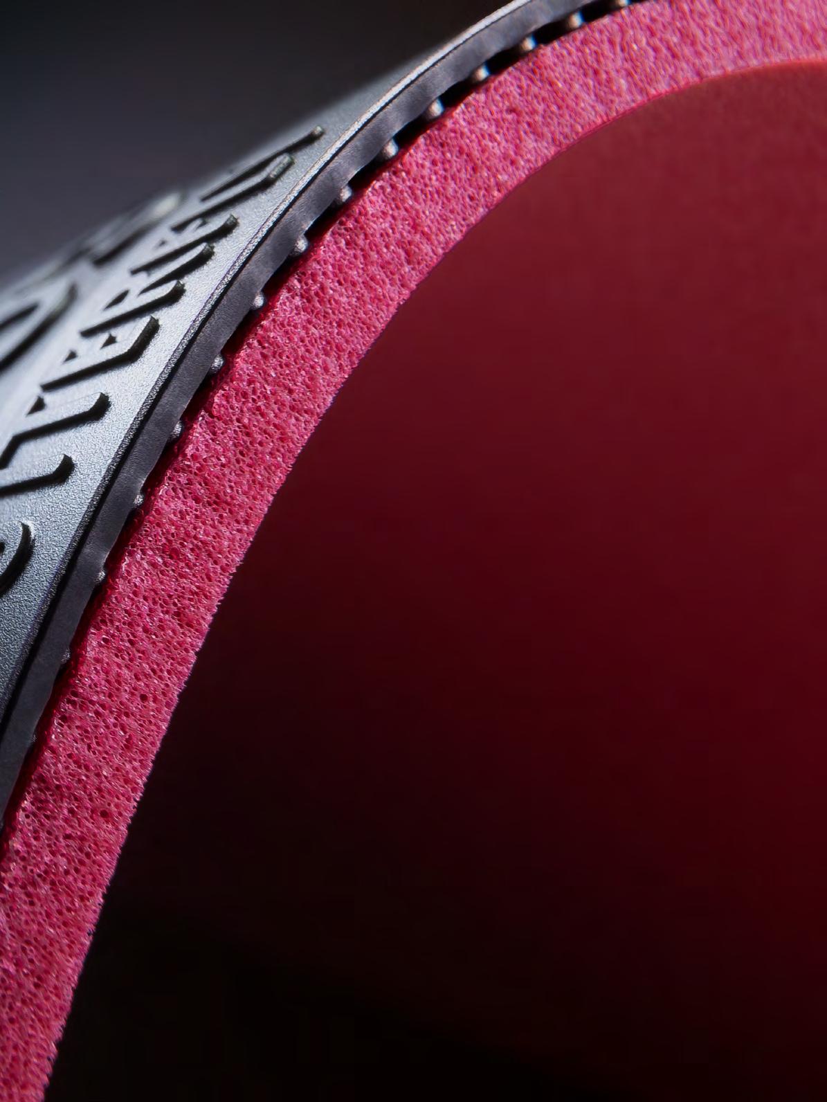 Durch die Verkürzung der Noppen wurde die Oberschicht dünner. Um dies auszugleichen, wurde der Schwamm dicker gemacht*, wodurch eine optimale Rückprallleistung gewährleistet wird. Der dicke Schwamm reduziert den Energieverlust, indem er die Verformung des Balls beim Aufprall begrenzt und so einen solideren und kraftvolleren Schlag ermöglicht.