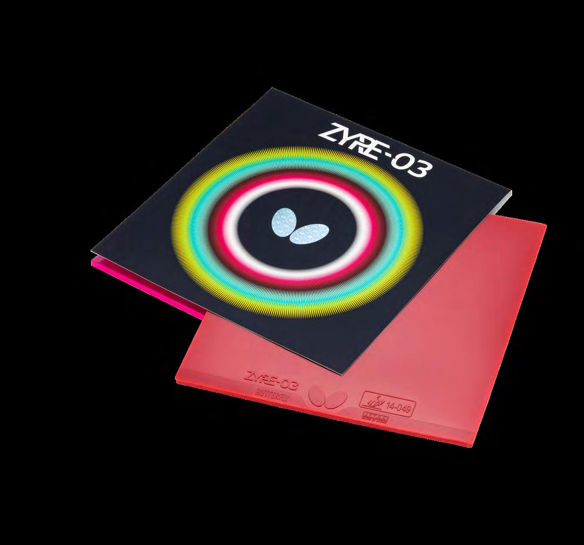 Der Zyre-Belag besteht aus dem neuartigen „Ricosheet“, einer Oberschicht mit eng gestaffelten, flachen Noppen, und einem extrem dicken Schwamm mit Spring Sponge X Technologie. Zusätzlich zu dieser besonderen Struktur verfügt der Belag über eine Oberfläche mit erhöhter Abriebfestigkeit und ein ausgezeichnetes Ballgefühl. Durch die Verwendung des Noppen-Codes Nr. 303, der mit Spin auch Kraft entfaltet, ermöglicht Zyre 03 Schläge, die mit starkem Bogen tief in der gegnerischen Spielfeldhälfte auftreffen. Dieser Belag wird für Spieler empfohlen, die mit kraftvollen, spinreichen Schlägen das Spiel dominieren möchten.