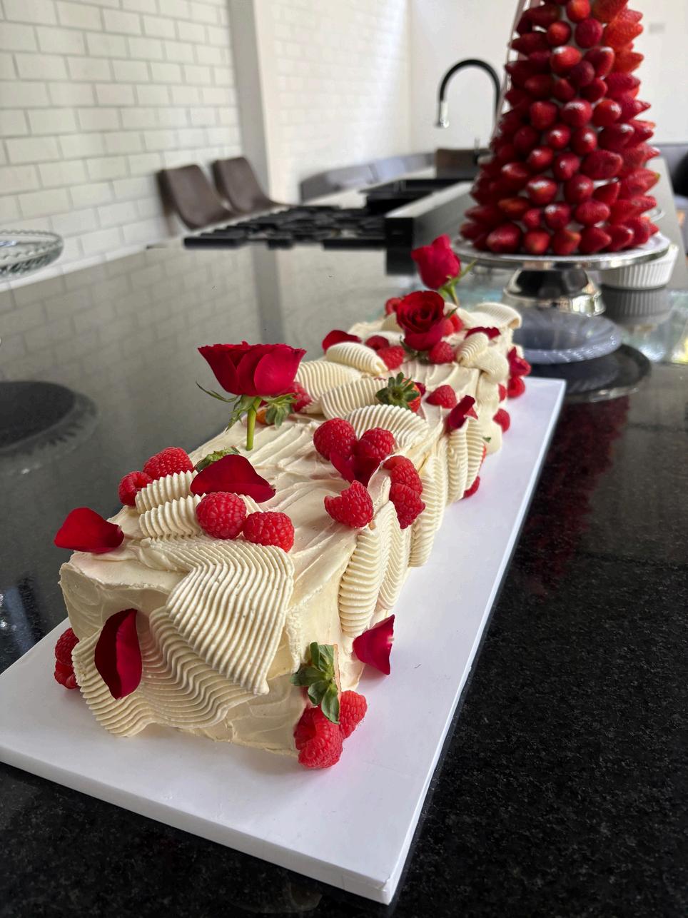 Masa de ralladura de limón y frambuesas frescas, humedecida con jarabe de limon y con un relleno de jalea de frambuesas casera y crema de frambuesas