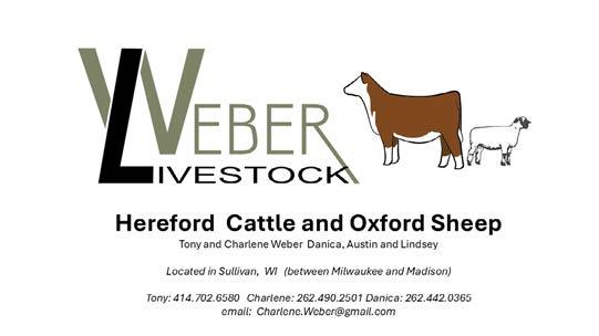 WEBER LIVESTOCK COMPANY, Anthony & Charlene Weber, N5150 Inlynd Dr, Sullivan, WI, 53178, C: (414)702-6580 Anthony, C: (262)490-2501 Charlene, Email: charlene.weber@gmail.com. Herd Information: Many of our cows go back to Delaney Hereford genetics. Our cows are feminine and deep bodied with solid EPDs. Stop by and take a look at this elite set of females.