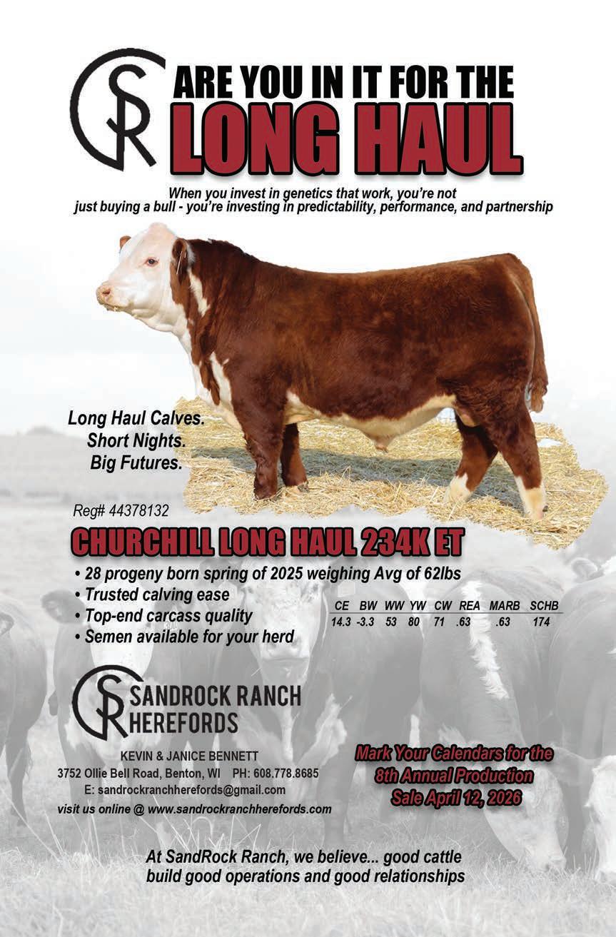 MGM DAMS have produced the 1st or 2nd HIGH SELLING BULLS at the WHA Sale in 21 of the last 23 years (even after they have been sold)! Steve, Jann, & Matt Merry Steve 414-881-5274 • Matt 608-617-9069 drstevemerry23@gmail.com • mgmpolledherefords.com