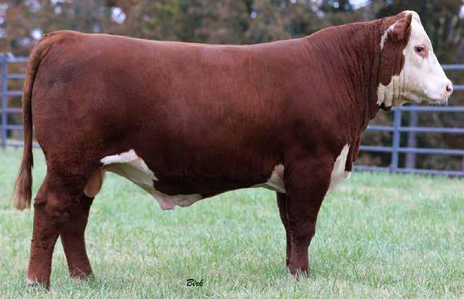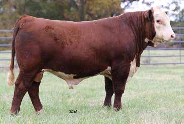 • A moderate, stout featured Trademark son. His dam E914 is a tremendous power cow often referred to as the most powerful X51 daughter in the country in terms of presence and stature. She sets if off with a beautiful udder. One of her sons topped our 2023 sale to Waggoner Cattle Co. in Mississippi. Ladd packs an elite EPD profile ranking high for Sustained Cow Fertility EPD, Udder EPD, Teat EPD, Marbling EPD, $BMI, $BII and $CHB. When you look at the traits that he is elite in all the signs point to a top producer for replacements.