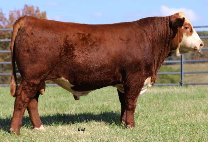 • Legend is a masculine, powerfully constructed son of the ABS Global member, Trademark. Legends dam has been the matriarch for the last several years compiling the following record: 6 at 108.7 at weaning, 6 at 106.7 at yearling, 9 at 104.2 for ribeye a d 9 at 103.1 for marbling. She has placed sons in purebred herds across the country including Ernst Herefords in Colorado, Olson Herefords in North Dakota, Triple L Ranch in Tennessee, Steinbeck Farms in Missouri, Ridenhour Hereford Ranch in Arkansas, Clifford Farms in Kentucky. She has been flushed numerous times and still maintained her Dam of Distinction honors. Her sons by Merit and Gunsmoke will headline the 2026 CMF Bull Sale. Legend ratioed 112 for weaning, 101 for yearling, and 106 for ribeye. He is dark red and red to the ground, with excellent pigmentation. He’s as sure a bet for a herd bull as we’ve produced.