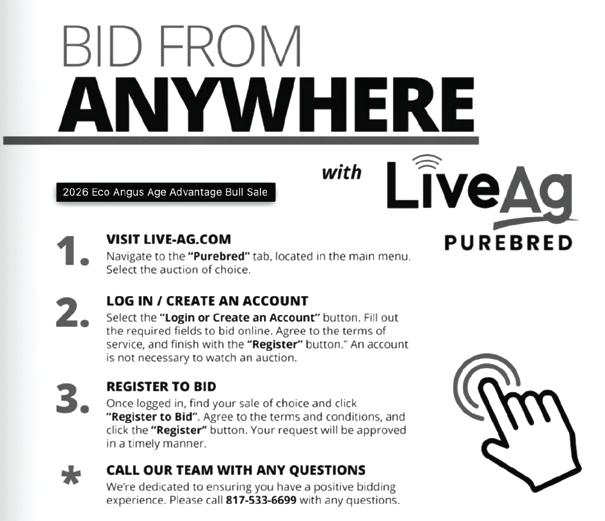 We hope you can make it on sale day Friday, February 27th @1pm, however if you cannot make it to the sale but would like to purchase a bull or bred heifer, online bidding is available at www.Live-Ag.com.