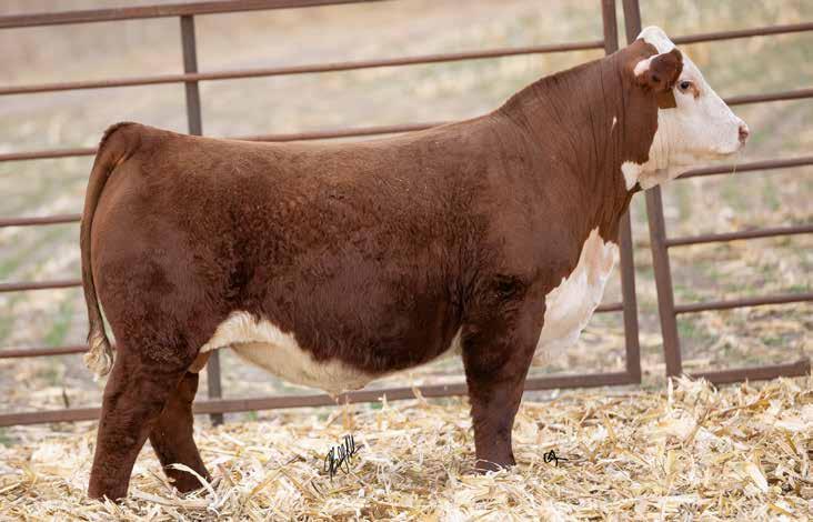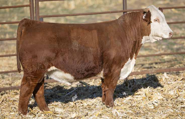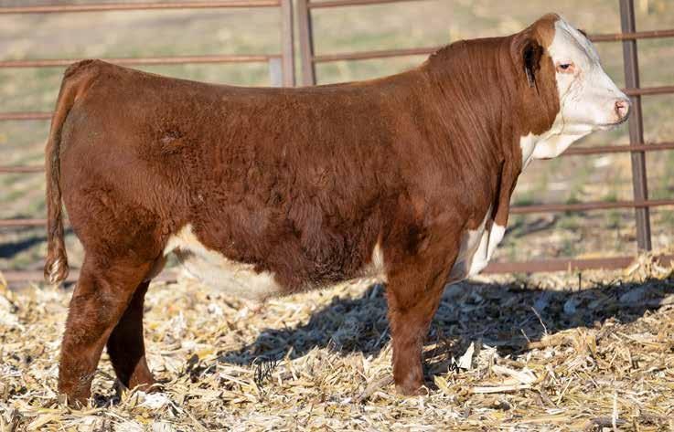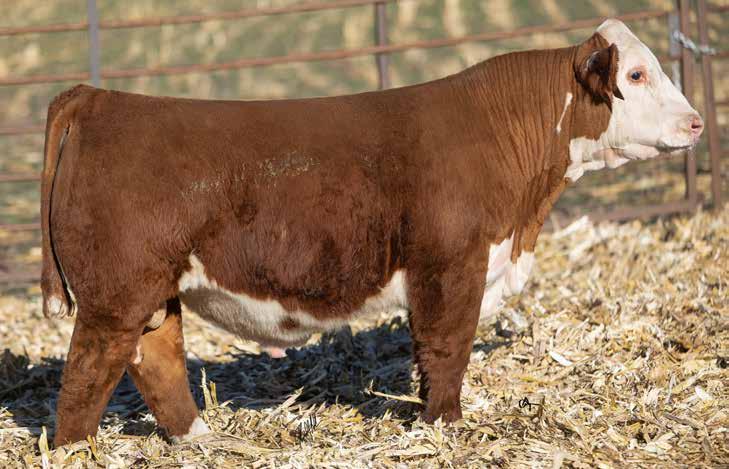 Polled, Partially Pigmented. Out of one of our favorite cows!! This bull has a set of figures now. I’d feel confident in using him on heifers. The Thomas County progeny are extremely efficient on feed. His EPD’s have had a recent boost due to feed efficiency testing at Schu-Lar Polled Herefords. Pay SPECIAL attention to who this bull’s mom is! Top 1% $CHB, Top 1% CWT, Top 1% UDDER, Top 2% SC, Top 2%