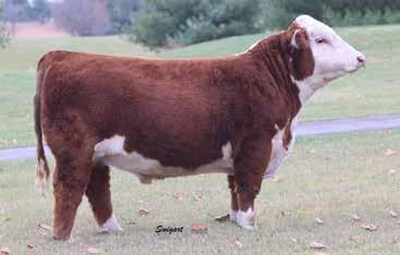 that will stand the test of time and set a solid foundation for any herd. • Bred AI on 6/18/22 to AH JDH NUNSON 15E ET, then pasture exposed to NJW 53E 254G RIDGE 37G from 7/15/22 to 9/19/22. CE BW WW YW DMI SC SCF MM M&G 3.7 2.2 50 72 0.1 0.6 16.8 26 51 MCE MCW UDDR TEAT CW FAT REA MARB 5.0 84 1.10 1.10 61 0.018 0.61 0.20 BMI$ 359 BII$ 430 CHB$ 112 45 44311204 • Calved: 8/25/21 • Tattoo: BE 35J COW EFBEEF BR VALIDATED B413 {CHB} {DLF,HYF,IEF,MSUDF,MDF} EFBEEF TFL U208 TESTED X651 ET {SOD} {CHB}{DLF,HYF,IEF,MSUDF} BIRDWELL VANGUARD 5022 9337 {CHB} {DLF,HYF,IEF,MSUDF,MDF} EFBEEF 4R THYRA Y865 {DLF,HYF,IEF} P44021997 BR SENSATION 028X 3335 5022 {DLF,HYF,IEF,MSUDF} CHURCHILL SENSATION 028X {SOD} {DLF,HYF,IEF,MDF} BR TRUST 100W 6171 3335 {HYP} KCF BENNETT BEDFORD E177 {CHB} {DLF,HYF,IEF} BEHM 100W CUDA 504C {CHB} {DLF,HYF,IEF,MSUDF,MDF} MGM LEADER GIRL 36G {DLF,HYF,IEF,MSUDF,MDF} KCF MISS PROFICIENT Z8 {DLF,HYF,IEF} P44103705 MGM X51 KESSEYS SENSATION 34E {DLF,HYF,IEF,MSUDF,MDF} UPS SENSATION 2296 ET {DLF,HYF,IEF,MSUDF,MDF} MGM KESSEYS SHADOW 34C ET {DLF,HYF,IEF} MGM VANGUARD GIRL 35J {DLF,HYF,IEF,MSUDF,MDF} Consigned by MGM Polled Herefords • One of the very first bred Vanguard daughters to sell! Deep red with eye pigment, lots of thickness and very correct. She’s homozygous polled with lots of milk and growth. • BW of 67 lb. with an Adj. WW of 630 lb. Ultra sounded @ 11.49 REA and 5.48 IMF to confirm her EPDs. • Bred AI on 10/29/22 to CMF 1720 GOLD RUSH 569G ET. Examined safe and due 8/9/23. CE BW WW YW DMI SC SCF MM M&G 5.3 1.7 60 92 0.7 1.1 17.6 40 70 MCE MCW UDDR TEAT CW FAT REA MARB 4.0 76 1.50 1.50 72 0.038 0.62 0.47 BMI$ 385 BII$ 485 CHB$ 141 46 IOWA SELECT Hereford Sale 2023 15