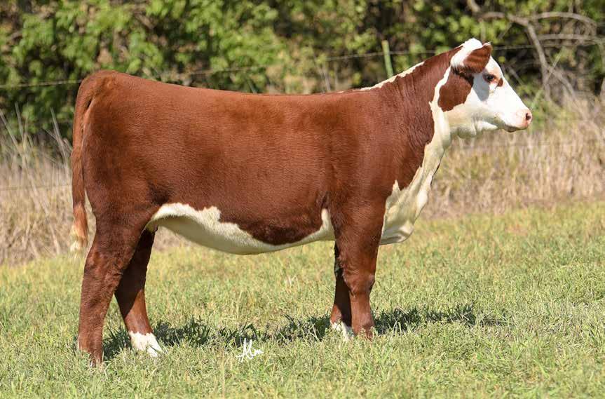 34 39LOT 40LOT KCF BENNETT ENCORE Z311 ETNJW 79Z Z311 ENDURE 173D ET BW 91H 100W RITA 79Z ETLOEWEN GENESIS G16 ET MSU TCF REVOLUTION 4RLOEWEN 77 48 MISS 344N 4RB42ET PCR JACKLYN NIKOLE 344N HYALITE ON TARGET 936 {MSUDC}R LEADER 6964 R MISS REVOLUTION 1009KJ 271C TERRI LEAD 835E KJ TMG 236X TEBOW 646ZKJ 865A TERRI 271C KJ 208X TORI 865A DOB: 02/16/2021 REG: 44235835 POLLED39 KJ 835E GENETTE 300J ET Outstanding spread from Calving ease – birth – weaning weight! Her dam 835E is a perfect uddered R LEADER 6964 daughter! Bred AI to SCC 167Y Trust 1701 P43777035 on 5/9/22. Preg. checked safe to AI date. PE to KJ 482Y Leader 873E ET P43833918 5/15/22 - 7/6/22 CE BW WW YW DMI SC SCF MM M&G MCE 11.4 1.3 70 115 0.8 1.7 15.9 27 62 7.6 121 1.2 1.2 87 0.038 0.64 0.23 $365 $459 $143 MCW UDDR TEAT CW FAT REA MARB BMI BII CHB KCF BENNETT ENCORE Z311 ETNJW 79Z Z311 ENDURE 173D ET BW 91H 100W RITA 79Z ETLOEWEN GENESIS G16 ET MSU TCF REVOLUTION 4RLOEWEN 77 48 MISS 344N 4RB42ET PCR JACKLYN NIKOLE 344N EFBEEF TFL U208 TESTED X651 ETEFBEEF BR VALIDATED B413 EFBEEF 4R THYRA Y865BR VALIDATED B413 5064 7603 CHURCHILL RED BULL 200ZBR RED BULL 200Z 2111 5064 BR BENNETT OF 5240 2111 DOB: 02/17/2021 REG: 44270874 HOMO POLLED40 KJ 7603 GENETTE 307J ET 307J is a full sister to the high selling Hereford bull in the Denver Sale 2022! Selling to Larson Herford Farm, WI and Phil Barnett, New Zealand. She is moderate in her frame, look at her BREED LEADING figures! Top 1% Marbling, Top 2% CHB, Top 10% CE, Top 5% REA. Excellent pigment and markings! Homozygous Polled! Bred AI to KJ BJ 309C Leader 182F P43930534 on 5/9/22. Preg. checked safe to AI date. PE to KJ C15 Trust 452J 44279157 from 5/15/22 - 7/6/22 CE BW WW YW DMI SC SCF MM M&G MCE 8.4 0.9 62 96 0.8 1.6 18.3 32 63 7.8 66 1.2 1.2 78 0.128 0.76 0.72 $408 $528 $165 MCW UDDR TEAT CW FAT REA MARB BMI BII CHB