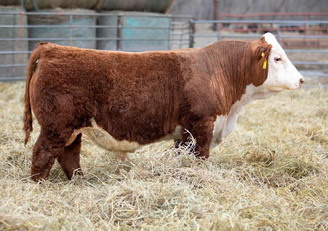 Long sided, sound running gear and a tight sheath. This bull is complete with enough frame and power to go along with a smooth shoulder that should be calving ease. His ten year old dam still raises on the best calves each year along with a beautiful udder.