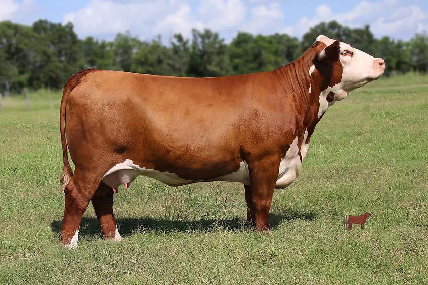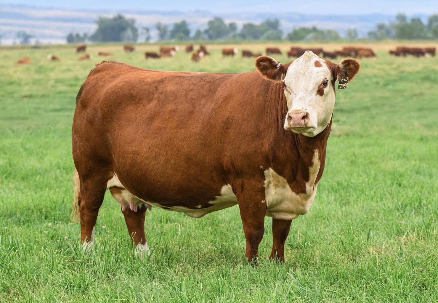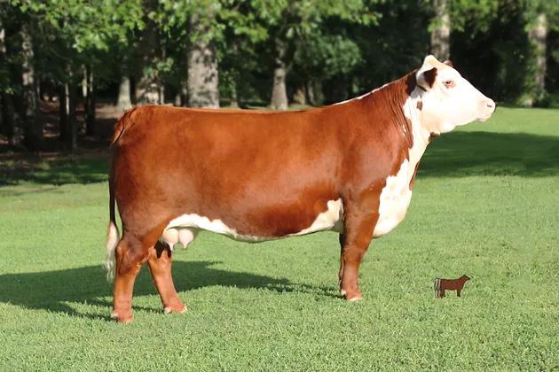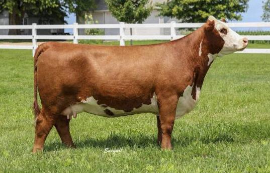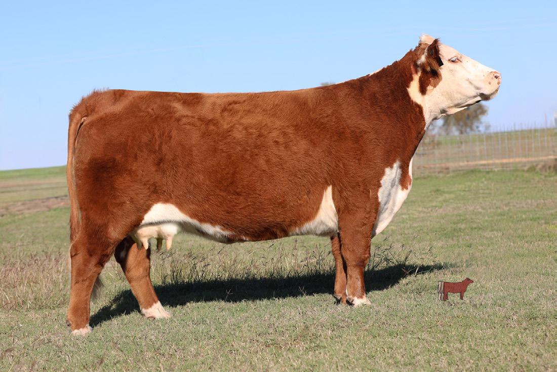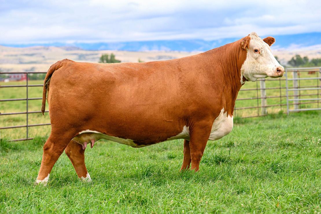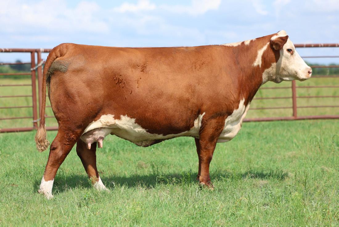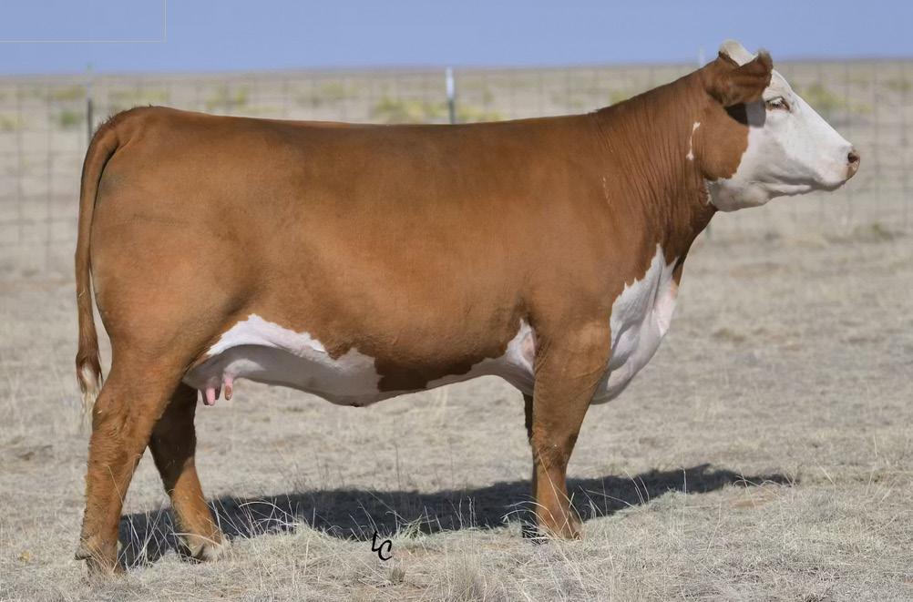 We went to the Churchill Dispersal in search of a POWER DONOR. 940G was one we identified very quickly. She is a massive beast that has Body and Depth that we have to have in the Hereford Breed as well as the Perfect Udder that we require. 940G has progeny in about 8 states and Canada. She is sired by Frontline who didn’t see a ton of use, but produced some really good daughters. That shouldn’t be a surprise as he is a son of Mariah (dam of 9333) and sired by our formerHerd Sire Manhattan. 940G is a Double Bred Sensation and a Double Bred 002X. Hard to go wrong here.