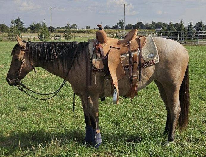 Brian Peak broke this TS home raised stud and we used him for a year before breeding him. He stands almost 16 hands and can really cover some country and move around for a big horse. We are hopeful the Rawhide buckskin trait will carry through to his colts.