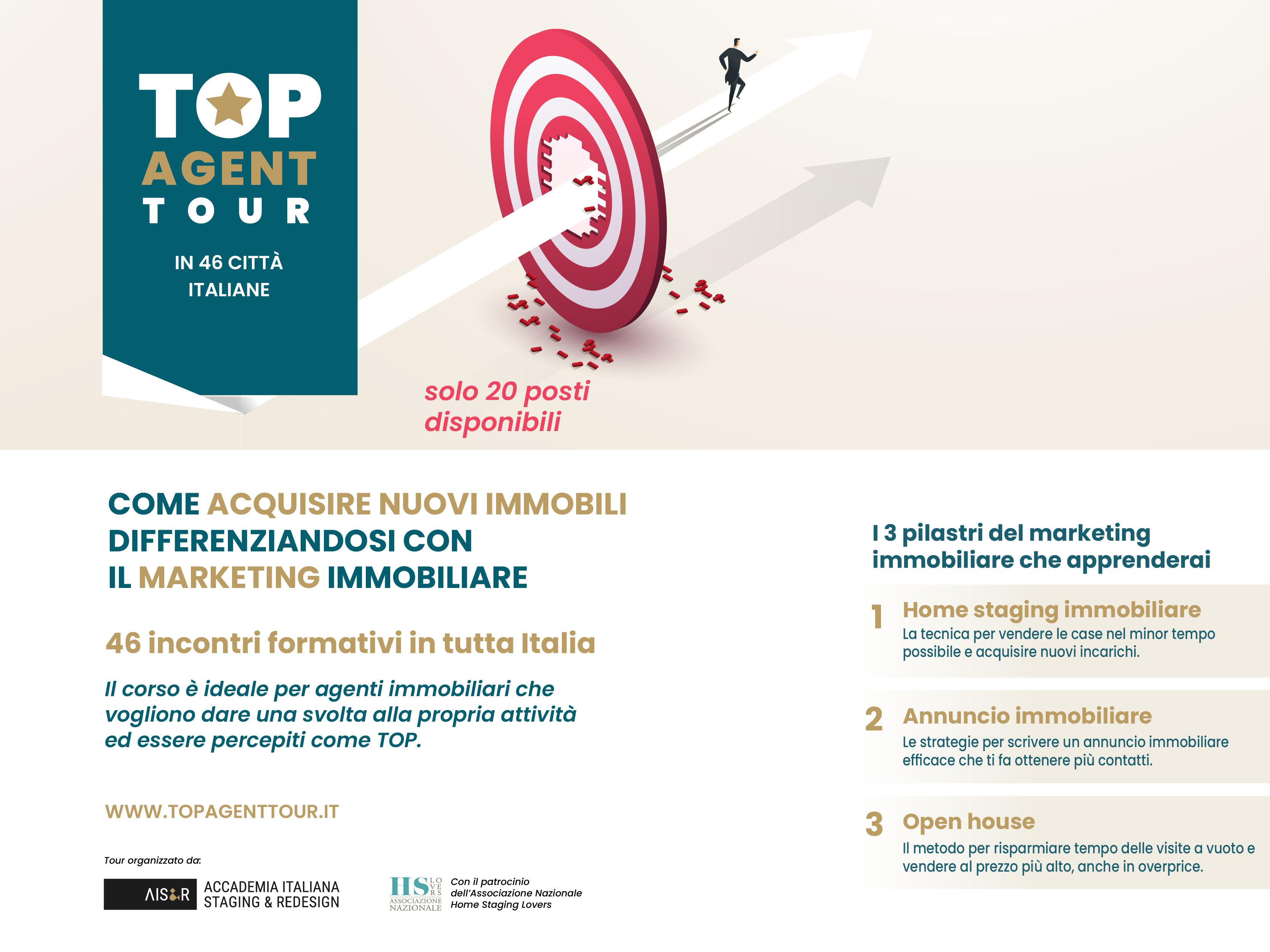 Visitailsitoufficiale https://topagenttour.it/ e iscrivitinellatuacittà,ipostisonolimitati.Finoal 20aprileilbigliettod’ingressoèinpromozione a€49+ivaanziché€69+ivaeseseiagente immobiliareilsecondobigliettoègratuitoperil tuocollegadiagenzia(inserisciilsuonominativo doverichiestonel form diacquisto).