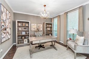The office features a beautiful focal point light fixture, crown molding and elegant wood flooring.