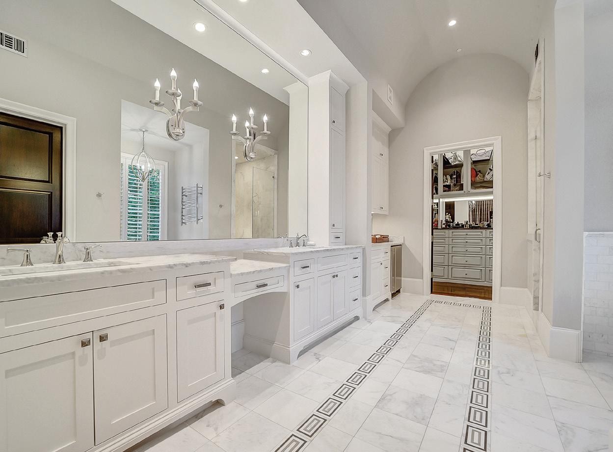 This timeless masterpiece in the heart of Piney Point on a prime corner village acre offers custom luxurious living both indoors and out. Exceptional architectural features include soaring ceilings, Palladian-style windows, barrel vaulted ceiling, and wide-plank oak floors. An elegant succession of arched entryways lead to the formal living and dining. The dream kitchen is equipped with chefgrade appliances, featuring slab Calcutta Gold marble and beamed ceilings. Adjacent to the kitchen are the butler’s pantry, breakfast