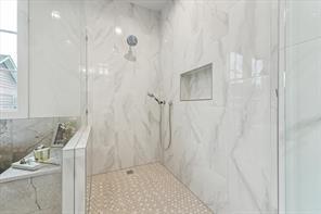 Modern bathroom with marble walls, glass shower door, gold fixtures, and a glimpse of a white towel and bathrobe.