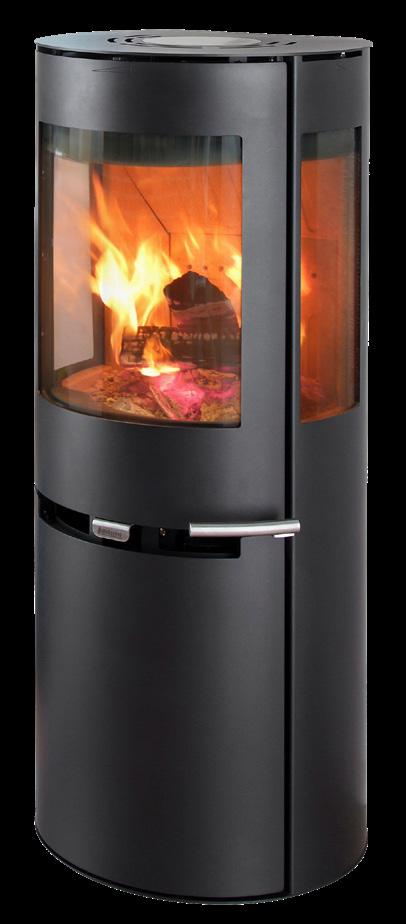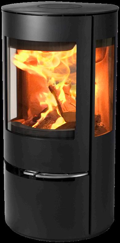 En stilren og moderne ovn med store glasspartier som gir 180 graders innsyn til flammene.